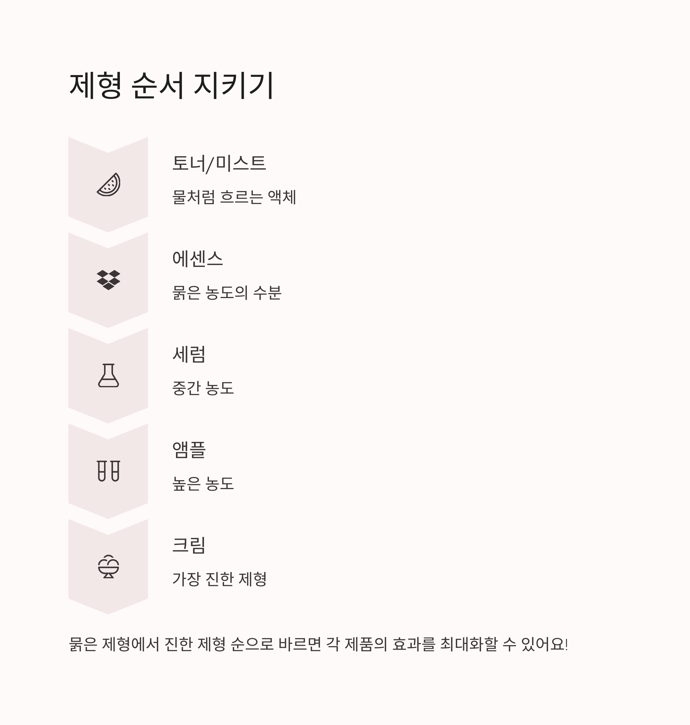 스킨케어의 황금률은 '묽은 제형에서 진한 제형 순'입니다. 이 순서를 지키는 것만으로도 각 제품의 효과를 최대한으로 끌어낼 수 있어요.