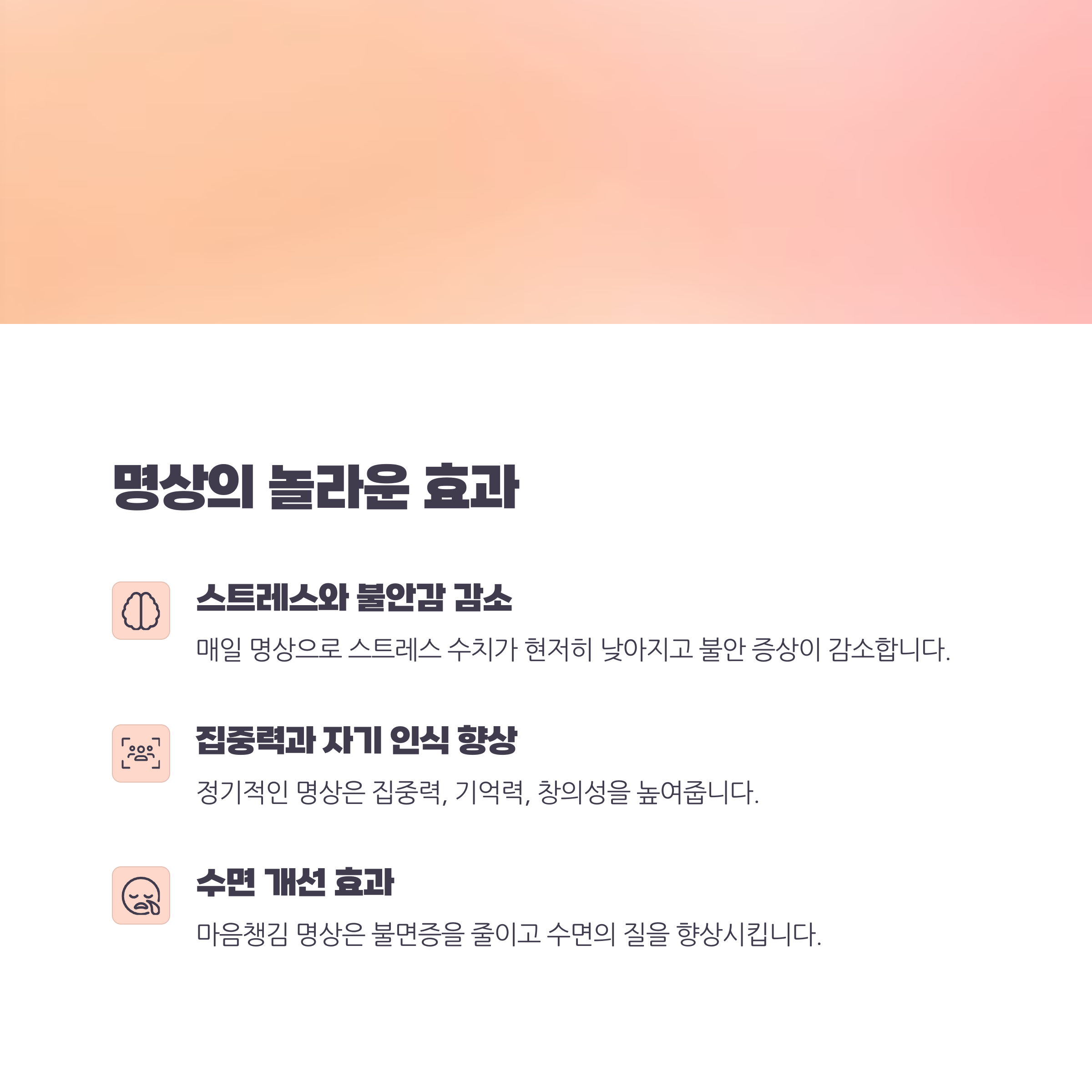 - 감사함 느끼기: 명상을 마치며 오늘 하루 감사한 것들을 떠올려봅니다.