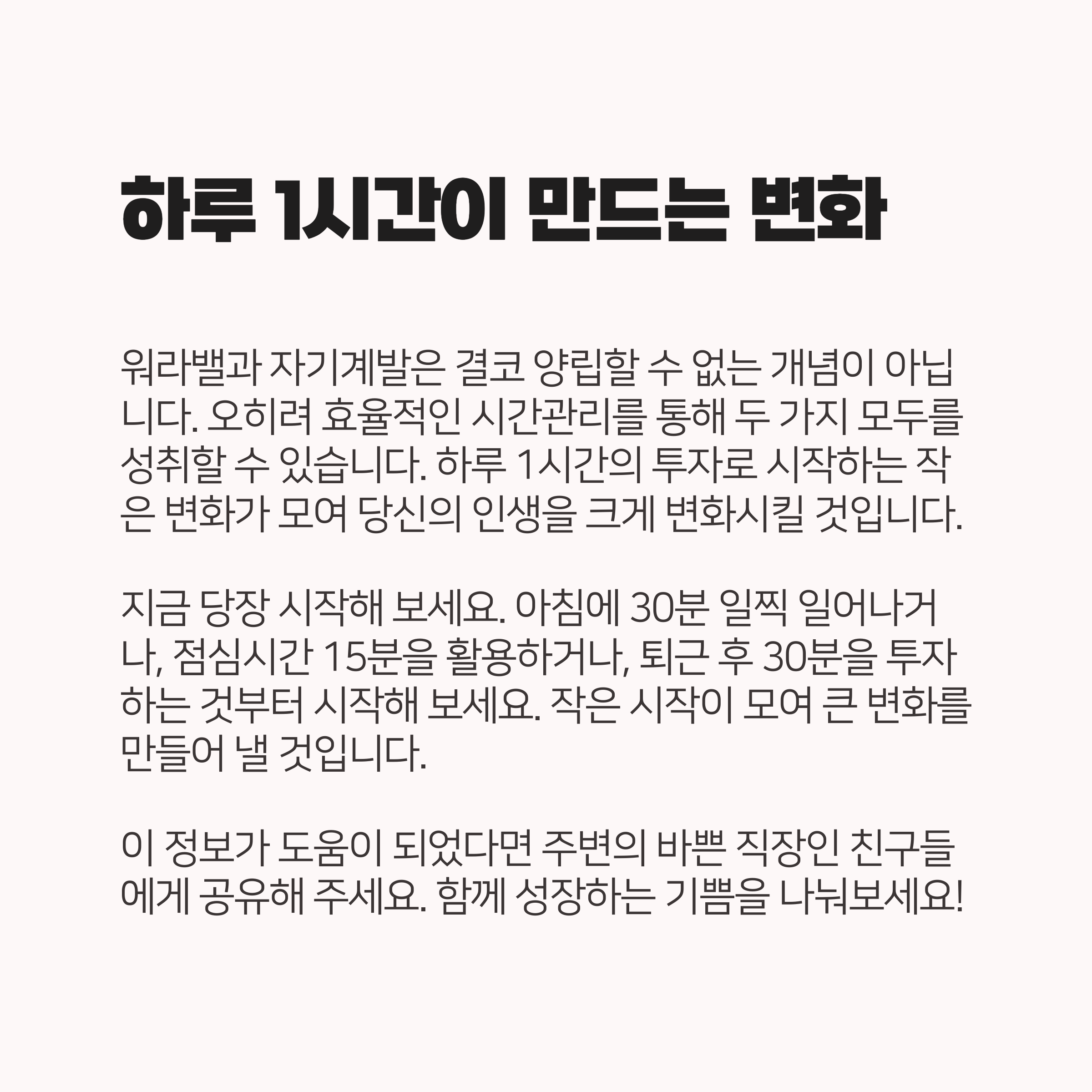워라밸과 자기계발, 두 마리 토끼를 모두 잡는 지혜로운 직장인이 되길 바랍니다.