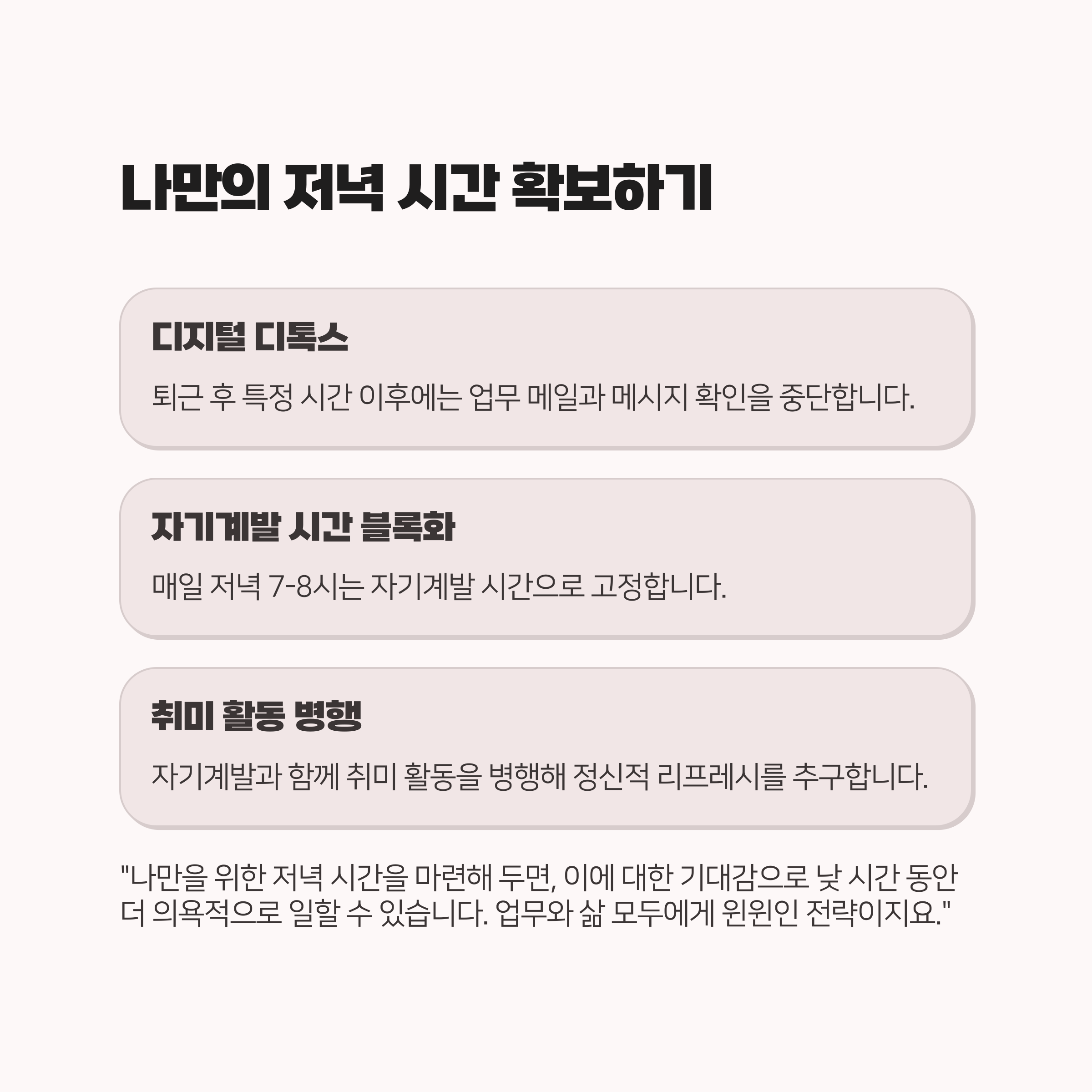 "나만을 위한 저녁 시간을 마련해 두면, 이에 대한 기대감으로 낮 시간 동안 더 의욕적으로 일할 수 있습니다. 업무와 삶 모두에게 윈윈인 전략이지요." 이는 워라밸 전문가들이 강조하는 중요한 포인트입니다.