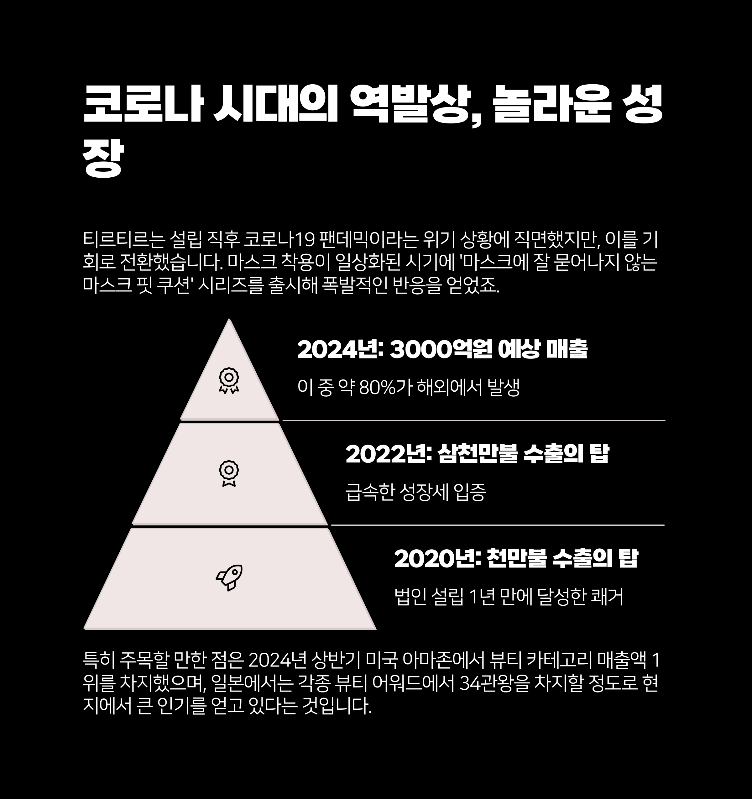티르티르의 성장 스토리는 그 자체로 하나의 혁신 사례입니다. 설립 직후 코로나19 팬데믹이라는 전 세계적 위기 상황에 직면했지만, 오히려 이를 기회로 삼았습니다. 마스크 착용이 일상화된 시기에 '마스크에 잘 묻어나지 않는 마스크 핏 쿠션' 시리즈를 출시하여 폭발적인 반응을 이끌어냈습니다.