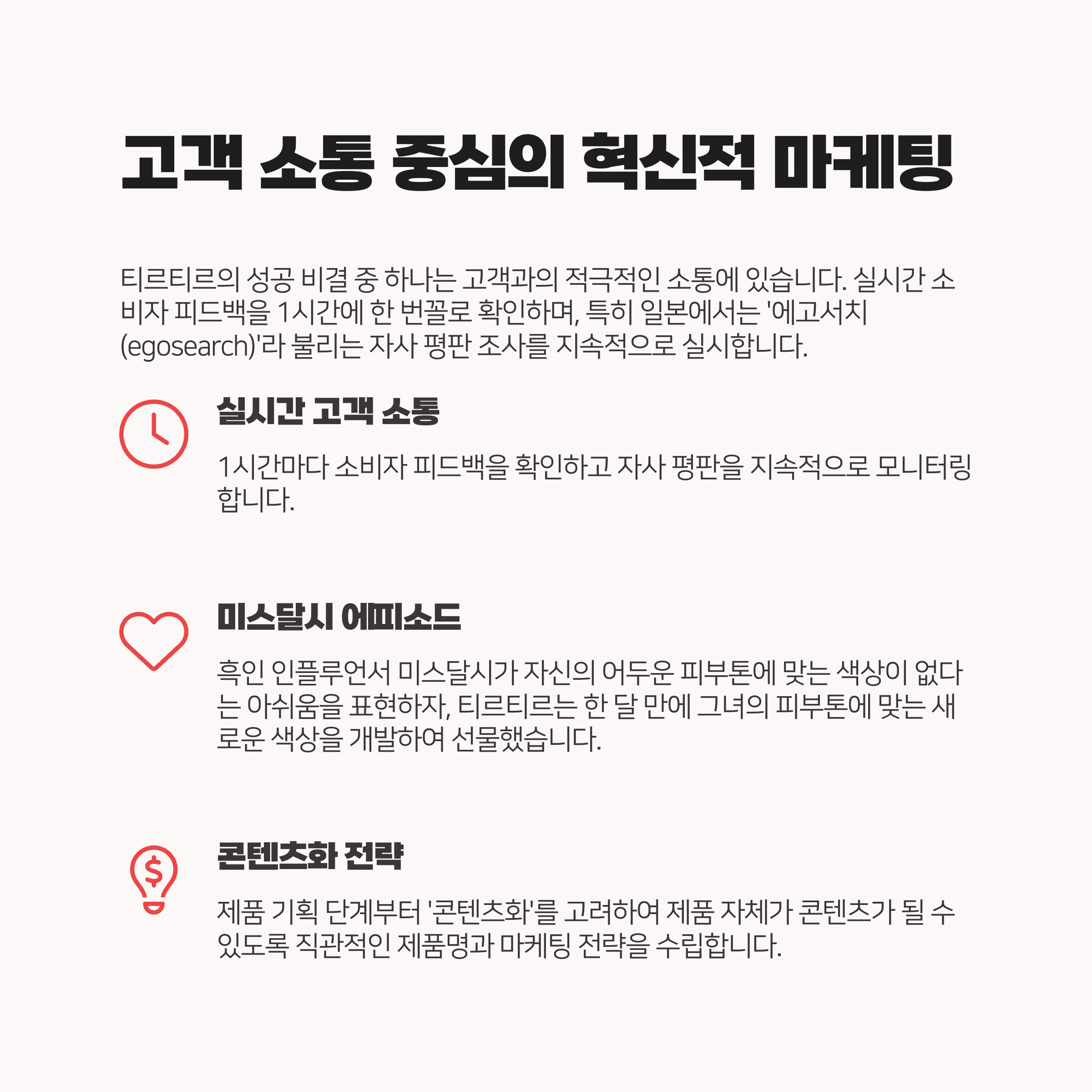 티르티르의 성공 비결 중 하나는 고객 소통 중심의 혁신적인 마케팅 전략에 있습니다. 티르티르는 실시간 소비자 피드백을 1시간에 한 번꼴로 확인하며, 특히 일본에서는 '에고서치(egosearch, エゴサーチ)'라 불리는 자사 평판 조사를 지속적으로 실시합니다. 소셜미디어에서 자사 상품에 대한 검색 및 선호도 조사를 통해 고객 요구를 파악하고, 이를 제품 개발에 적극 반영하는 것이죠.