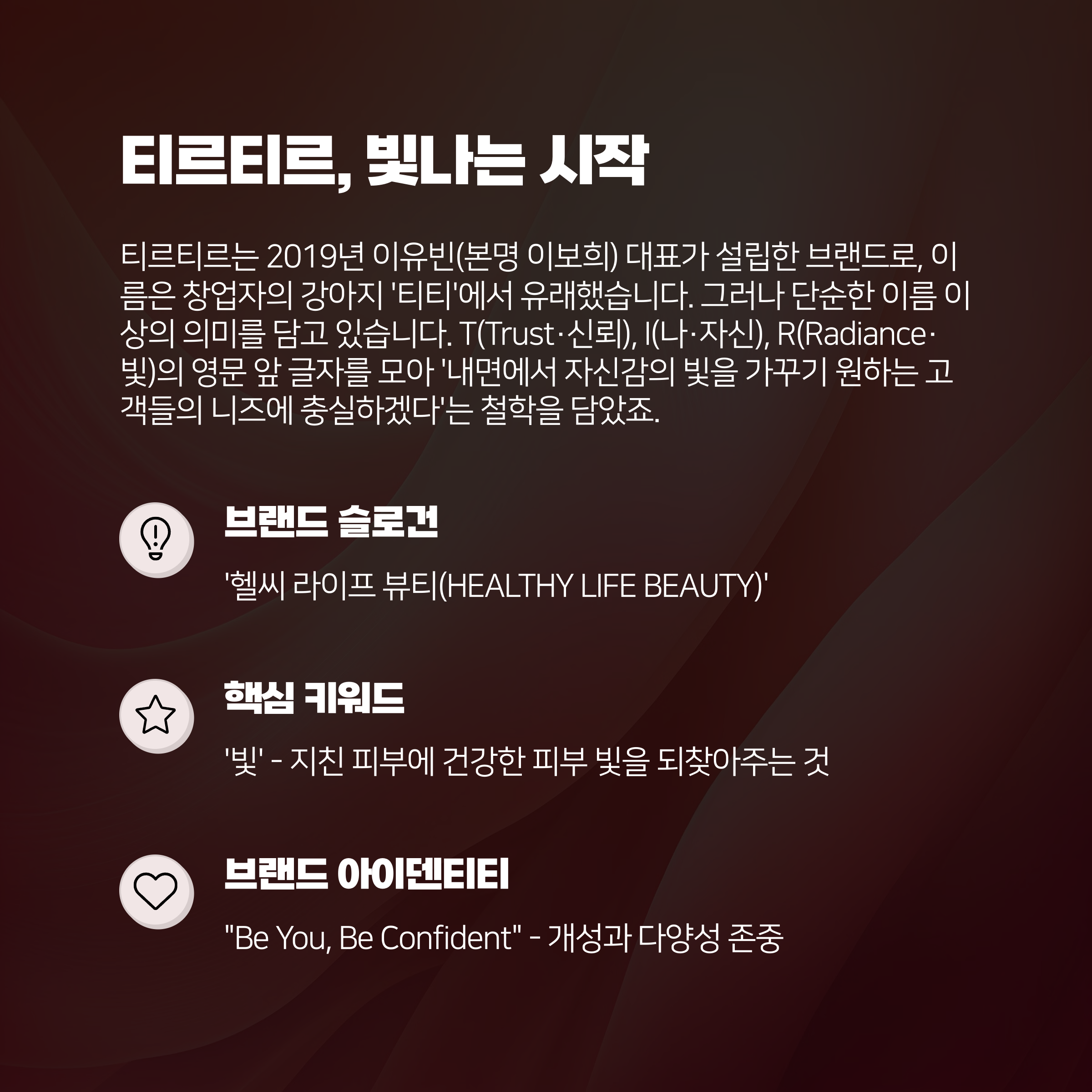 티르티르는 2019년 이유빈(본명 이보희) 대표에 의해 설립되었습니다. 브랜드명 '티르티르'는 창업자가 키우던 강아지 '티티'의 이름에서 유래했다고 합니다. 단순한 이름 이상의 의미를 담아, T(Trust·신뢰), I(나·자신), R(Radiance·빛)의 영문 앞 글자를 모아 '내면에서 자신감의 빛을 가꾸기 원하는 고객들의 니즈에 충실하겠다'는 브랜드 철학을 담았습니다.