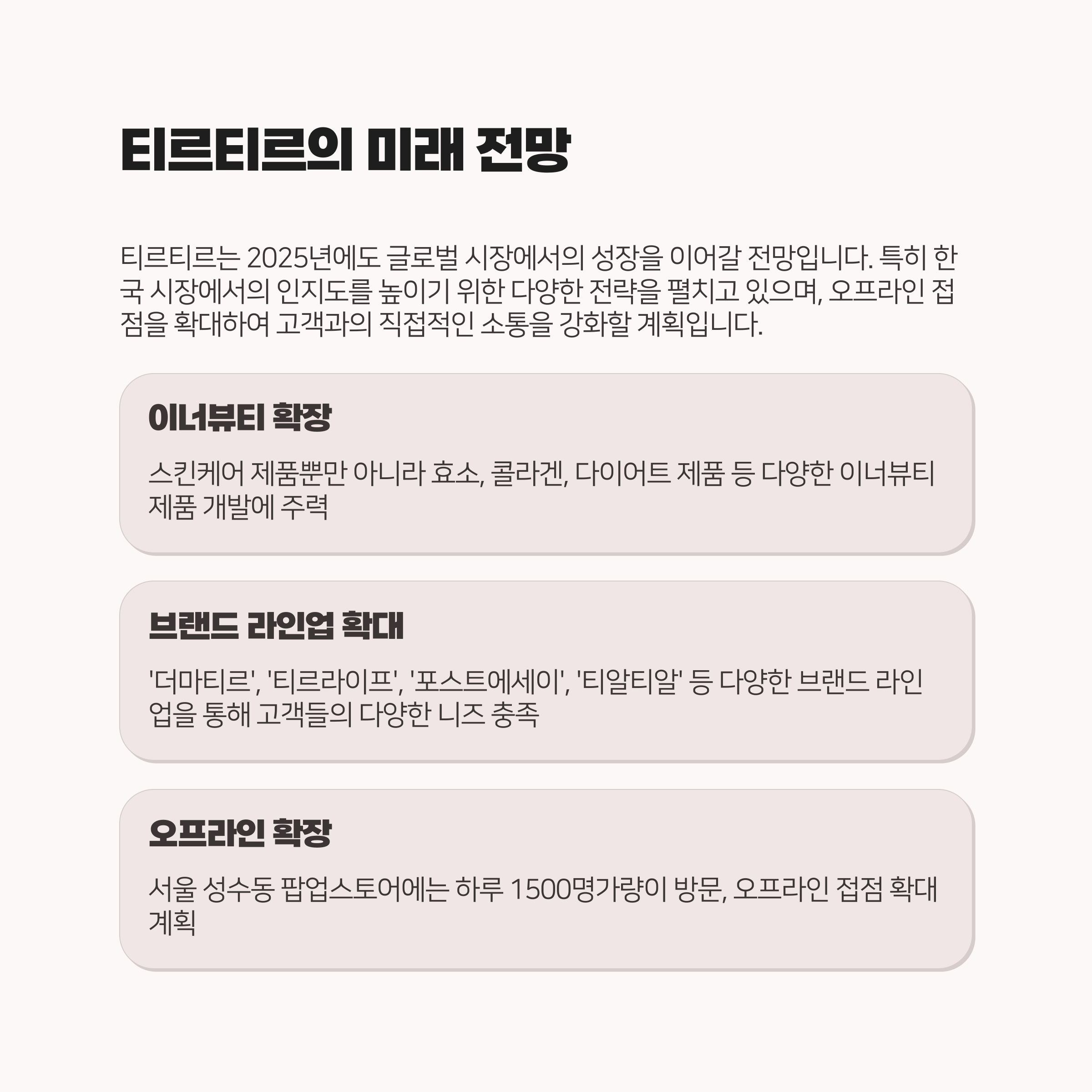 티르티르는 2025년에도 글로벌 시장에서의 성장을 이어갈 전망입니다. 특히 한국 시장에서의 인지도를 높이기 위한 다양한 전략을 펼치고 있으며, 오프라인 접점을 확대하여 고객과의 직접적인 소통을 강화할 계획입니다.