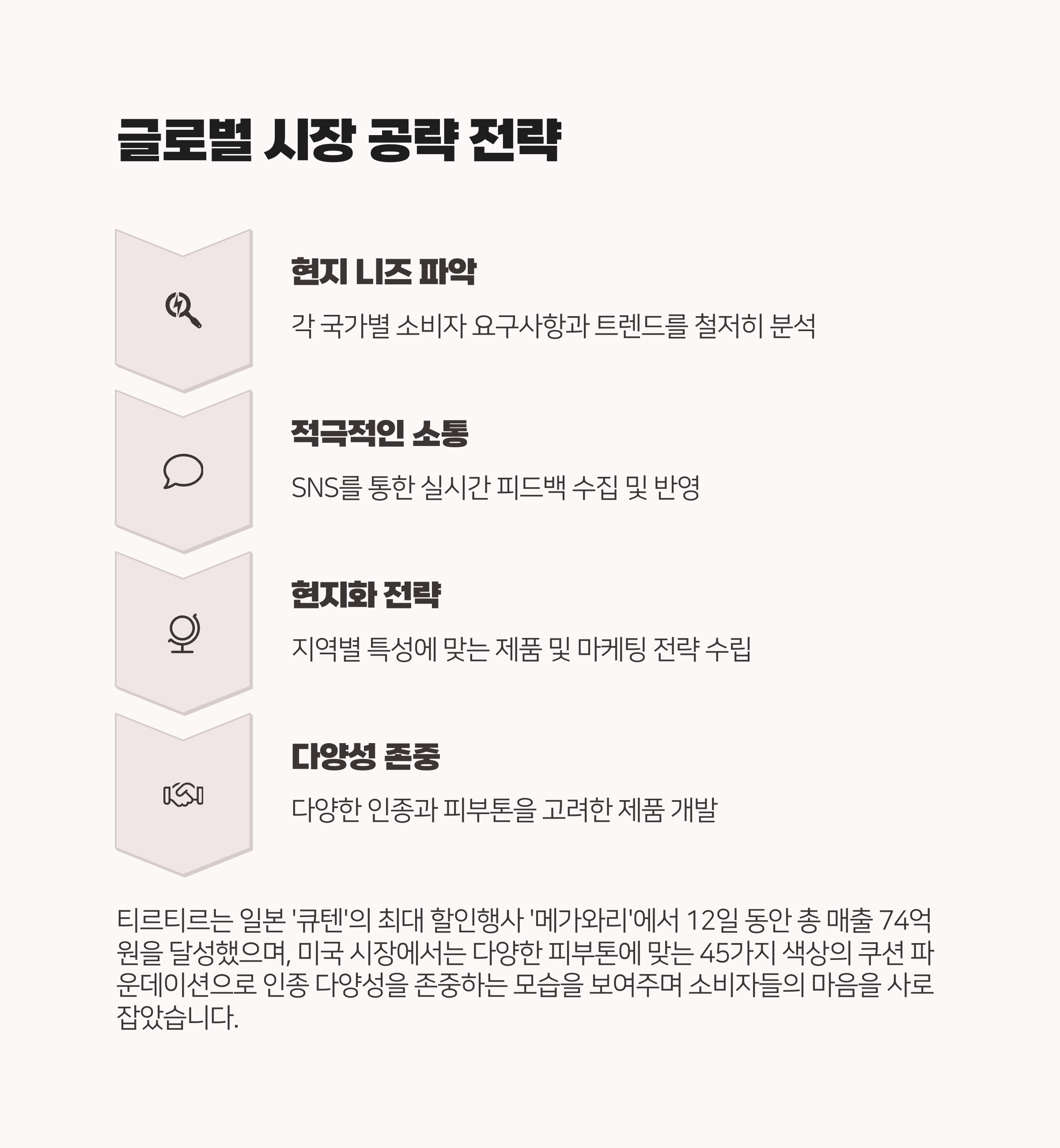 티르티르의 글로벌 성공 전략은 현지화와 소통에 있습니다. 특히 일본 시장에서의 성공은 주목할 만합니다. 티르티르는 일본 4대 오픈마켓 중 하나인 '큐텐'에서 진행한 최대 할인행사 '메가와리'에서 12일 동안 총 매출 74억 원을 달성했습니다. 이러한 성과는 현지 고객들의 요구를 정확히 파악하고 친밀하게 소통한 결과입니다.