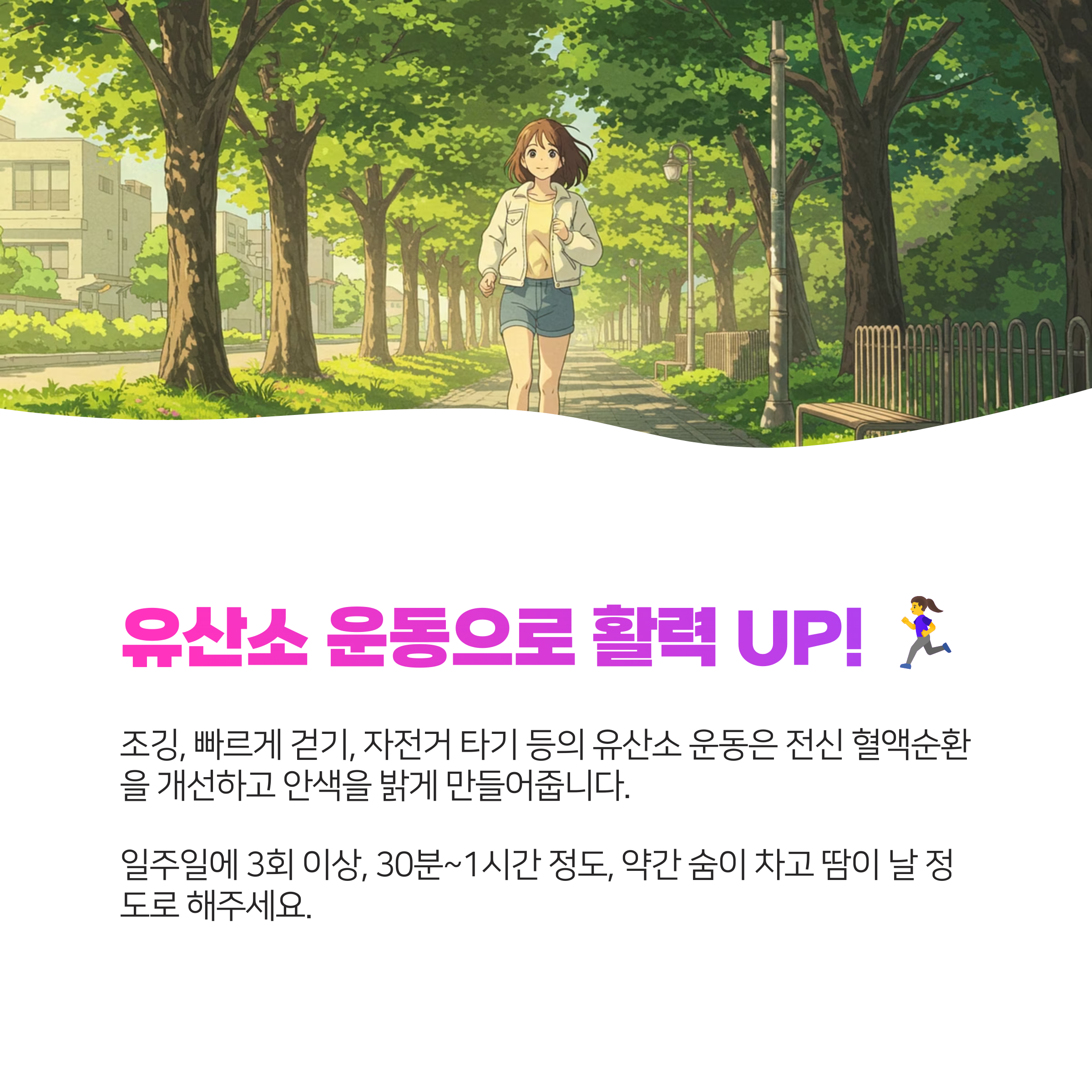 유산소 운동은 심폐 기능을 강화하고 전신 혈액순환을 가장 효과적으로 개선해요. 꾸준히 하면 안색이 눈에 띄게 밝아지는 것을 경험하실 수 있을 거예요. 🏃‍♀️