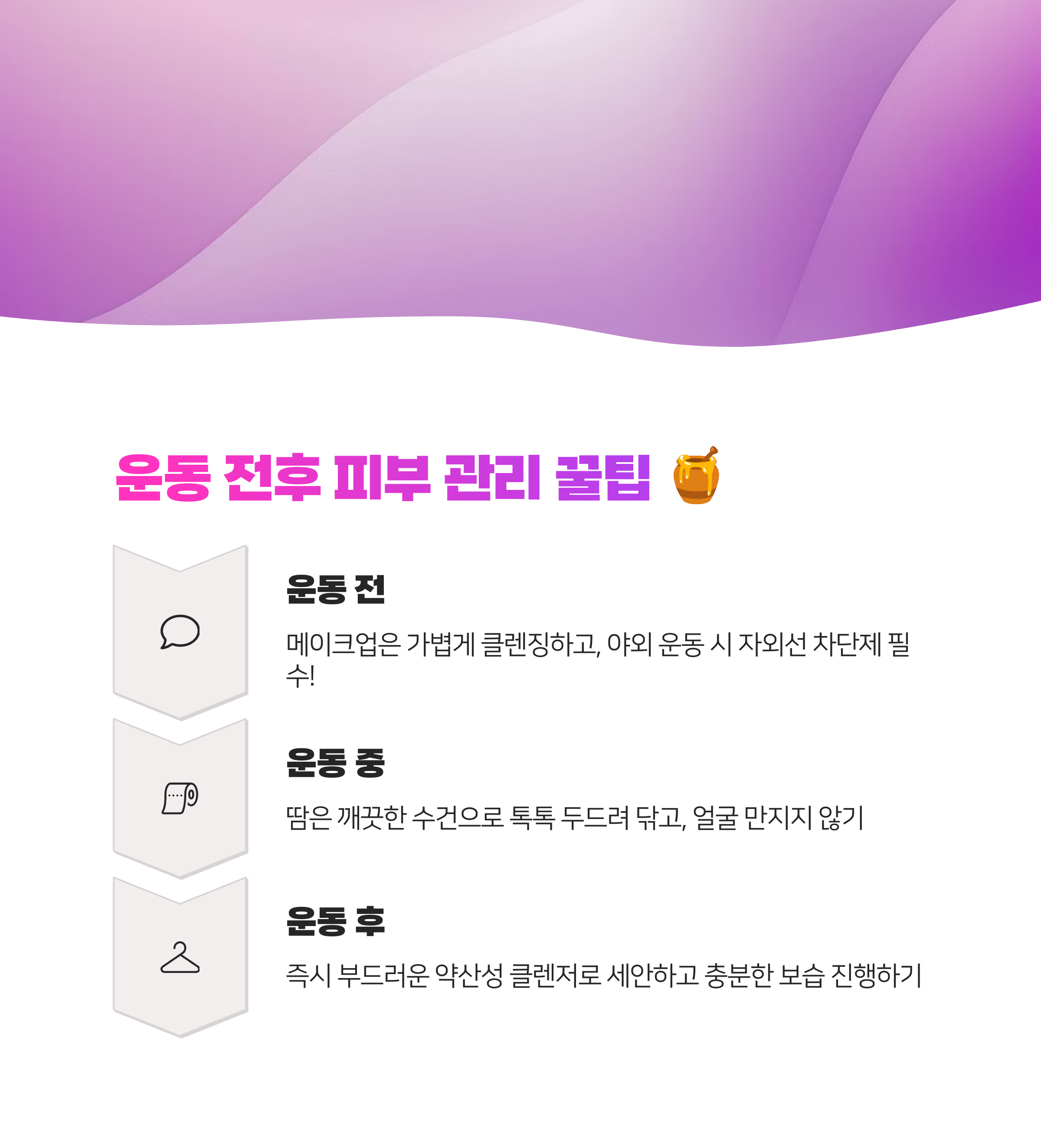 운동만큼 중요한 것이 바로 운동 전후 관리예요. 이걸 놓치면 오히려 피부에 독이 될 수 있답니다!