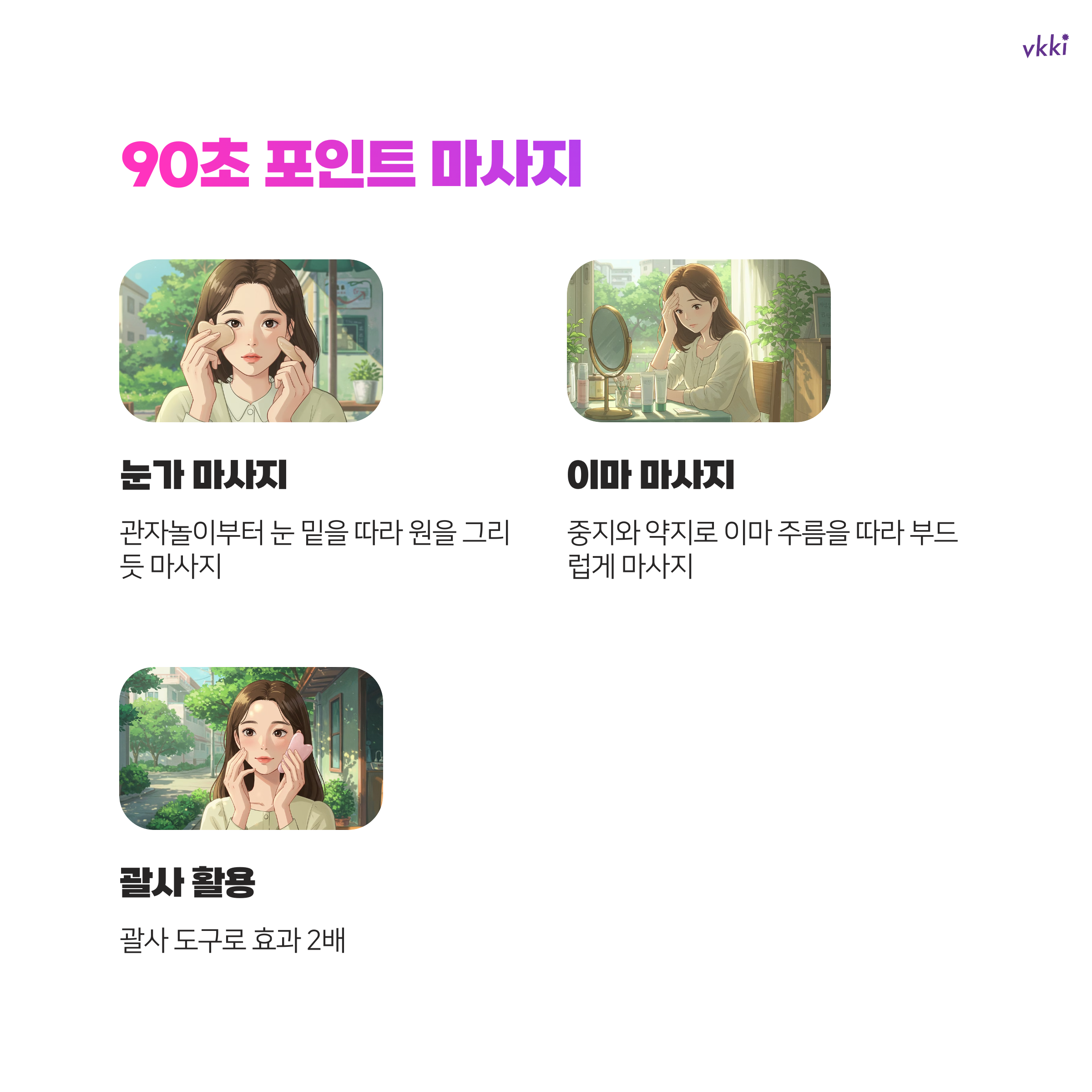 중지와 약지를 이용해 관자놀이부터 눈 밑을 따라 부드럽게 원을 그리듯 마사지하면 혈액순환이 촉진되고 부기 제거에도 효과적이에요.