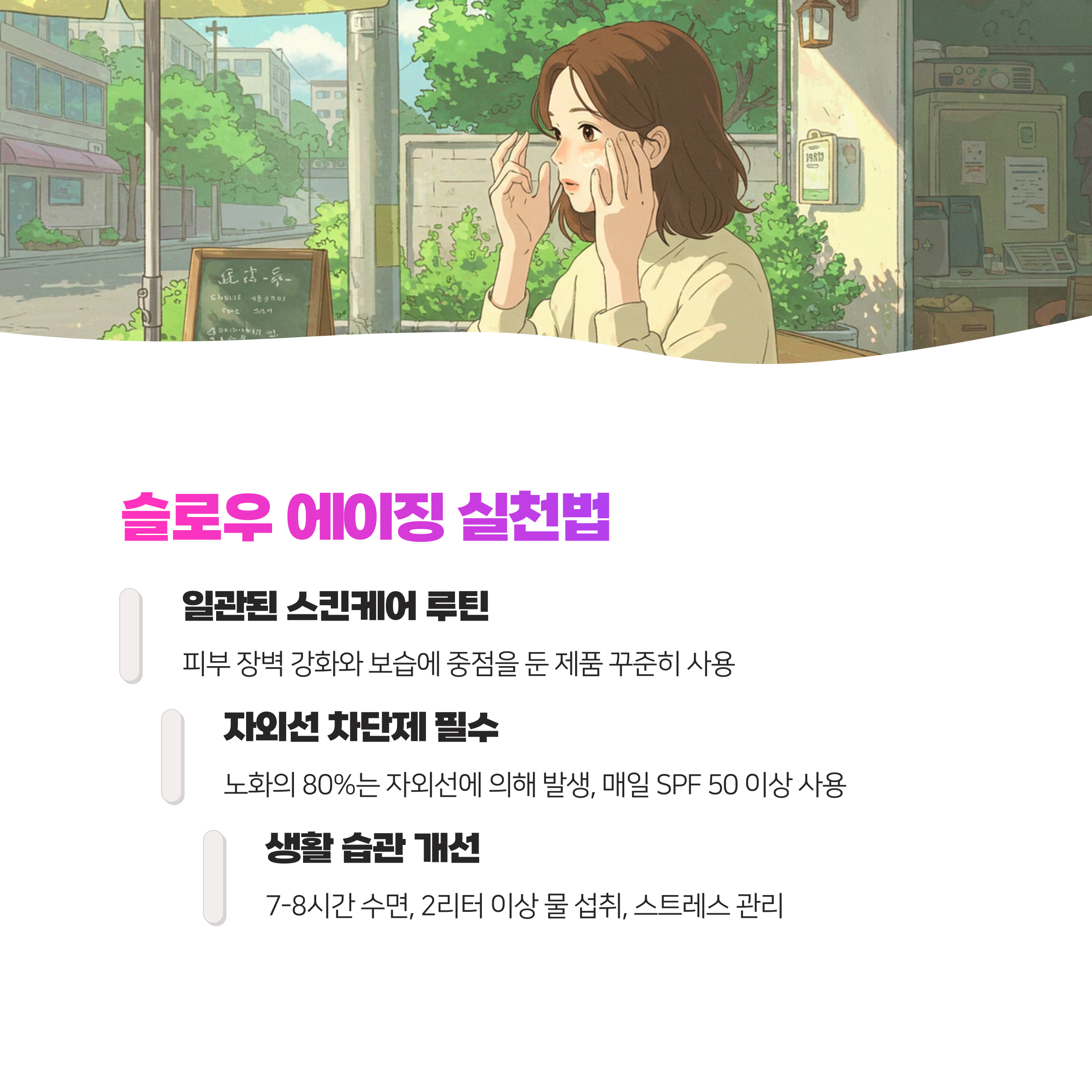 - 자외선 차단제 필수: 노화의 80%는 자외선에 의해 발생합니다. 매일 SPF 50 이상의 자외선 차단제를 바르는 것이 슬로우 에이징의 기본입니다.