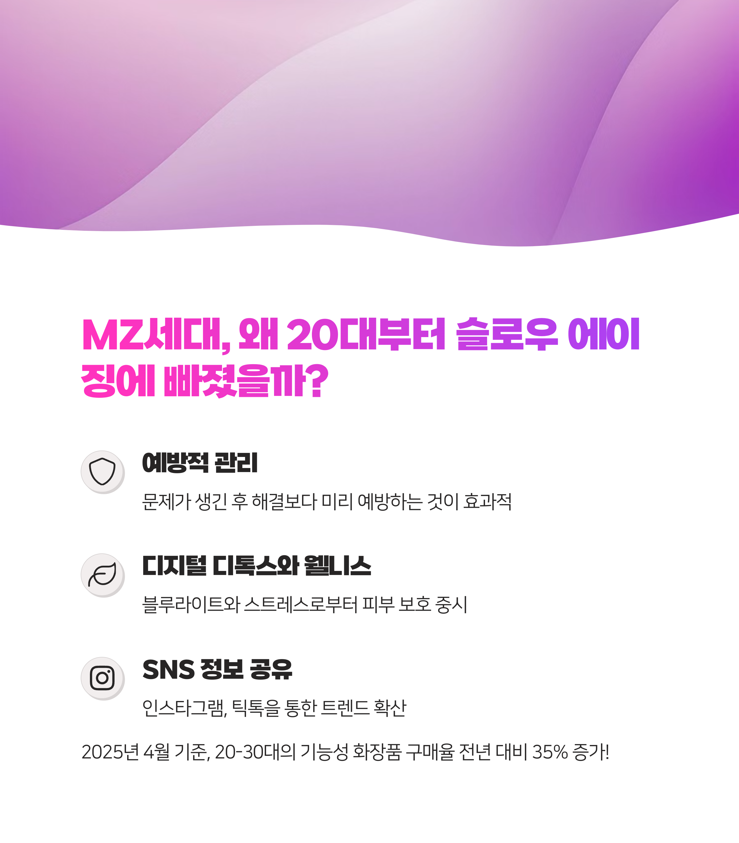 - 디지털 디톡스와 웰니스 트렌드: 디지털 기기 사용으로 인한 블루라이트 노출과 스트레스가 피부 노화를 가속화한다는 연구 결과가 알려지면서, 이에 대응하는 슬로우 에이징 제품들이 인기를 끌고 있어요.