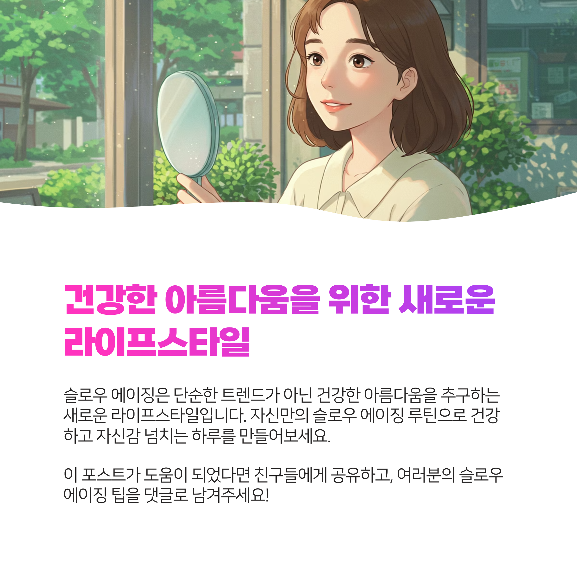 슬로우 에이징은 단순한 트렌드를 넘어 건강한 아름다움을 추구하는 새로운 라이프스타일입니다. 여러분도 이 글을 통해 알게 된 정보들을 바탕으로 자신만의 슬로우 에이징 루틴을 만들어보세요. 건강하고 아름다운 피부로 자신감 넘치는 하루하루를 보내실 수 있을 거예요!