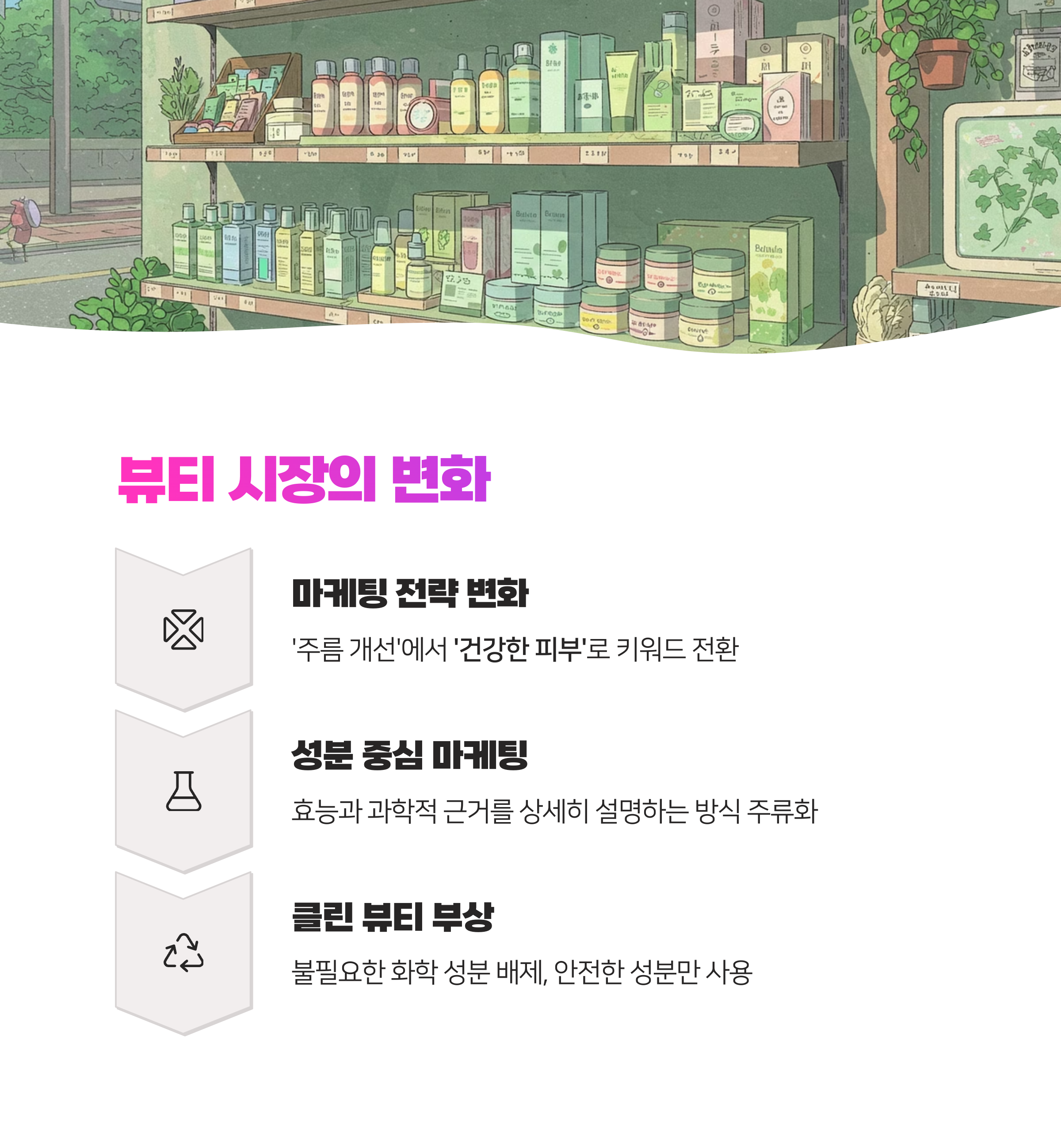 기존에는 '주름 개선'이나 '미백'과 같은 직접적인 효과를 강조했다면, 이제는 '건강한 피부', **'자연스러운 아름다움'**과 같은 키워드를 중심으로 마케팅이 이루어지고 있습니다. 또한 성분의 효능과 과학적 근거를 상세히 설명하는 성분 중심 마케팅이 주류를 이루고 있어요.