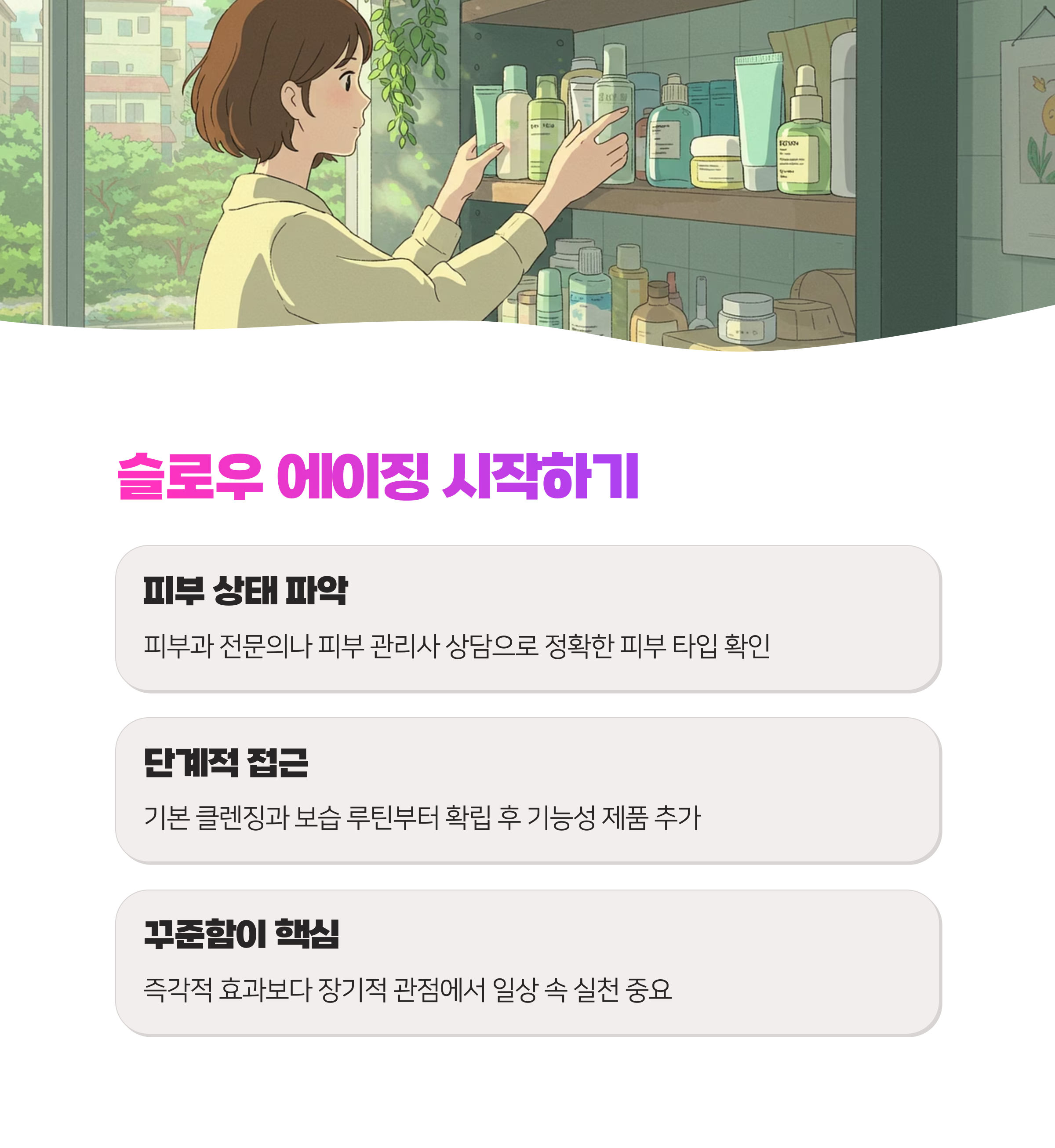 마지막으로, 슬로우 에이징은 꾸준함이 핵심입니다. 즉각적인 효과를 기대하기보다는 장기적인 관점에서 피부 건강을 생각하고, 일상 속에서 꾸준히 실천해 나가는 것이 중요합니다.
