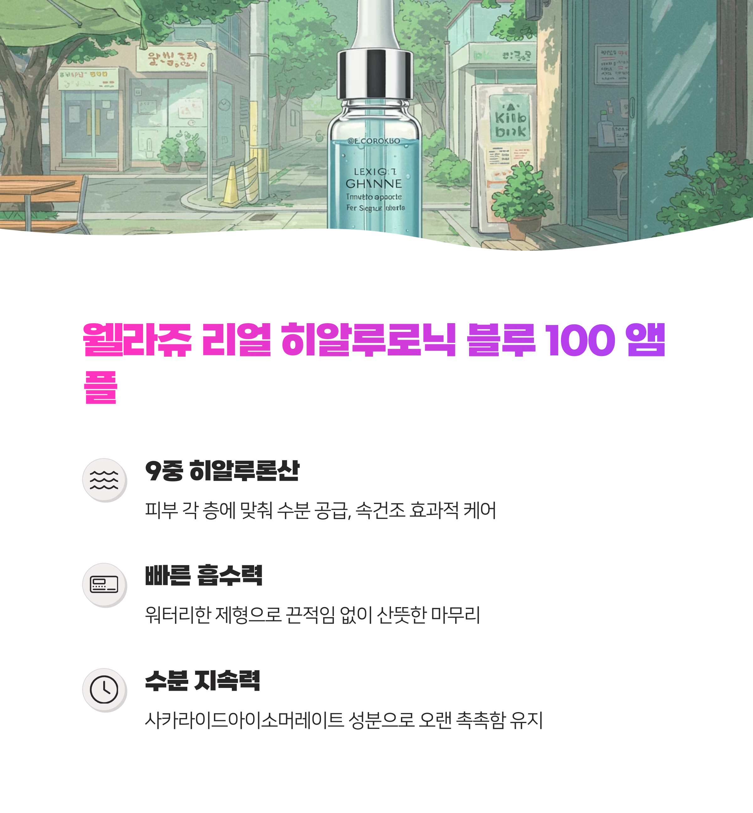 이 세 가지 히알루론산 앰플은 모두 속건조 해결에 탁월한 효과를 보이지만, 각자의 특징이 있어 자신의 피부 타입과 고민에 맞게 선택하시면 좋을 것 같습니다. 웰라쥬는 다양한 분자 크기의 히알루론산으로 전방위적 수분 케어에, 나인위시스는 나노 기술로 깊은 수분 침투에, 라네즈는 손상된 피부 장벽 리페어에 특화되어 있습니다.