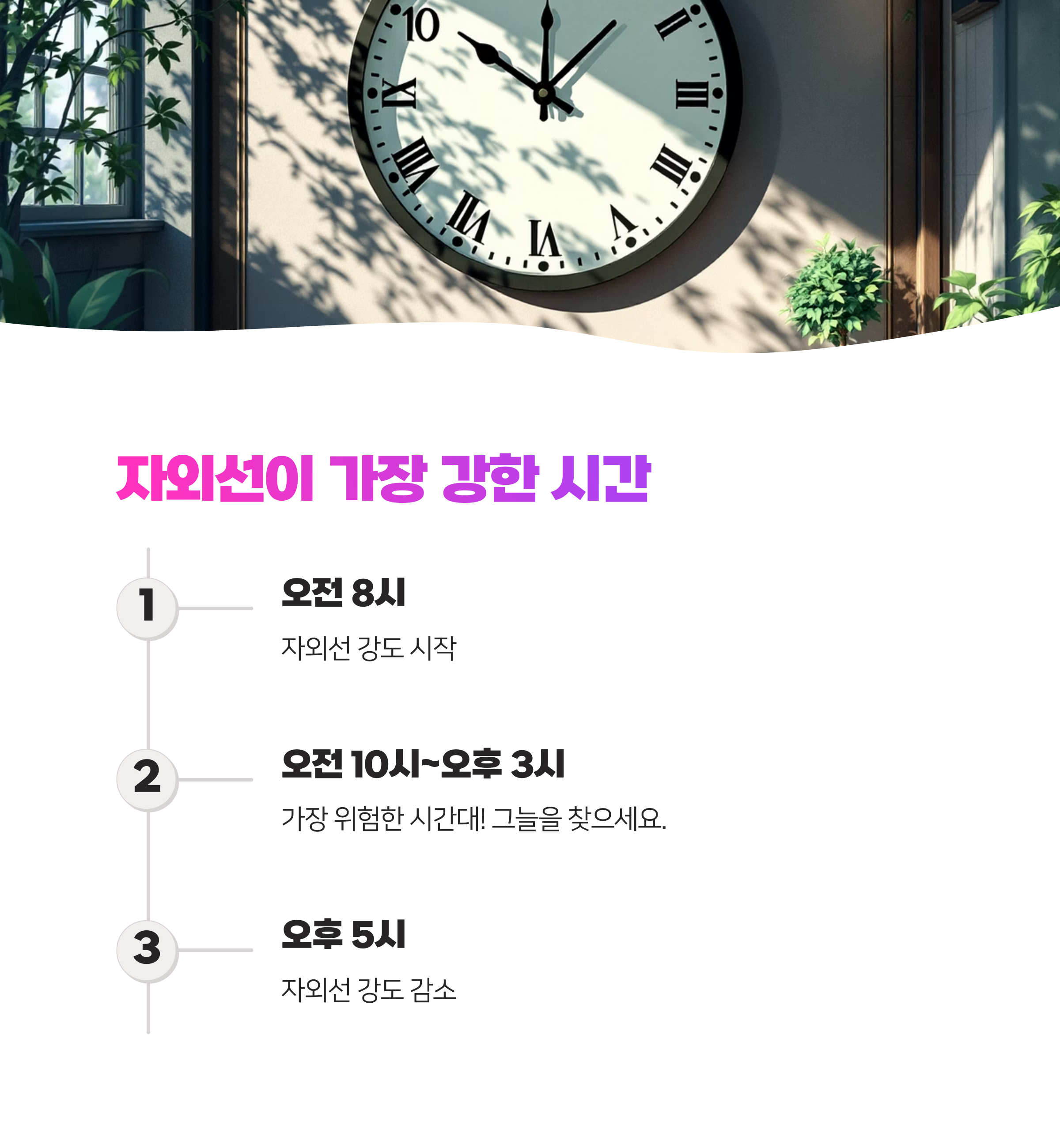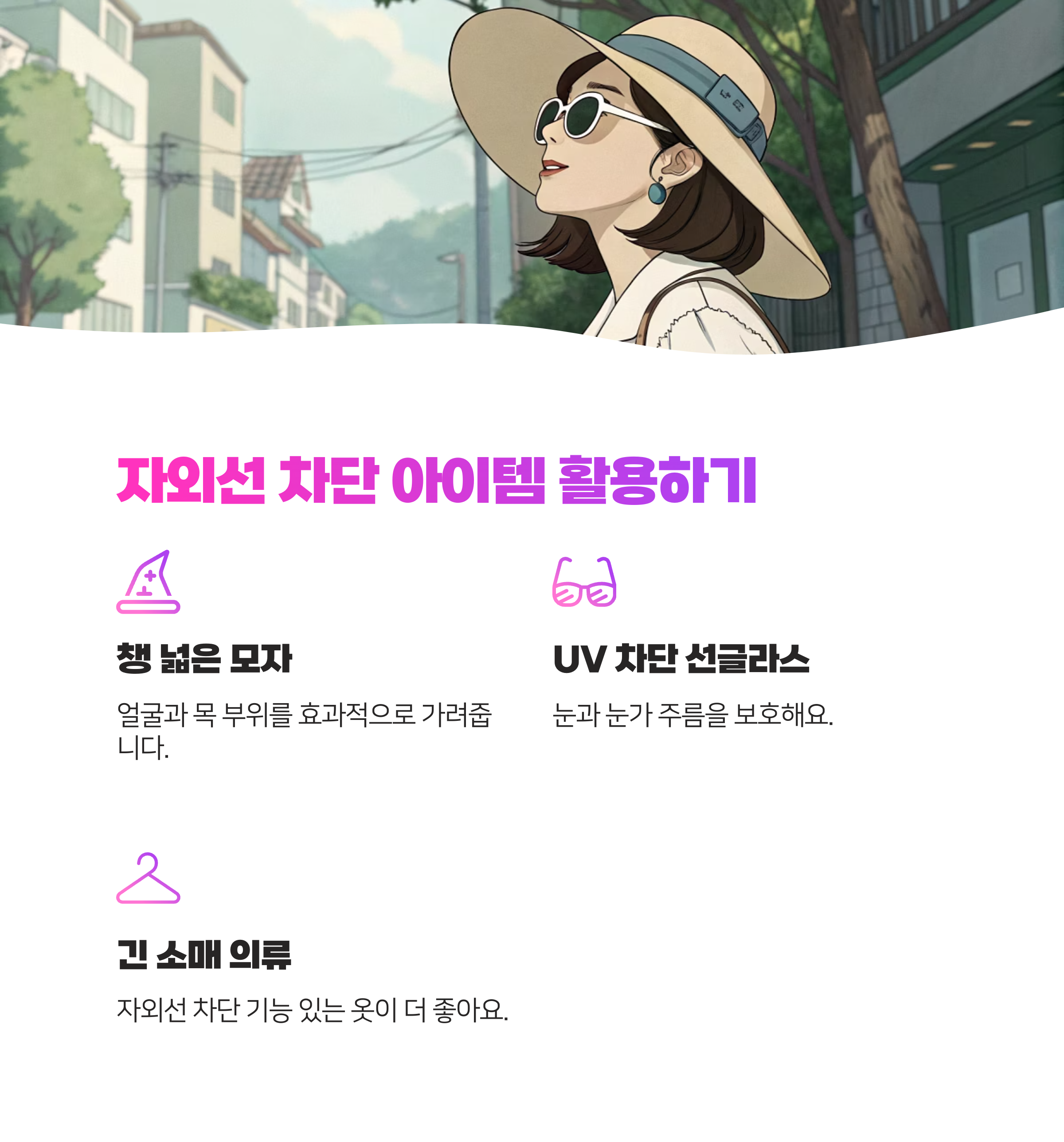 - 긴 소매 옷도 좋아요: 자외선 제일 센 시간(오전 10시 ~ 오후 3시)에는 긴 소매 옷이나 자외선 차단 기능이 있는 옷을 입으면 도움이 돼요.