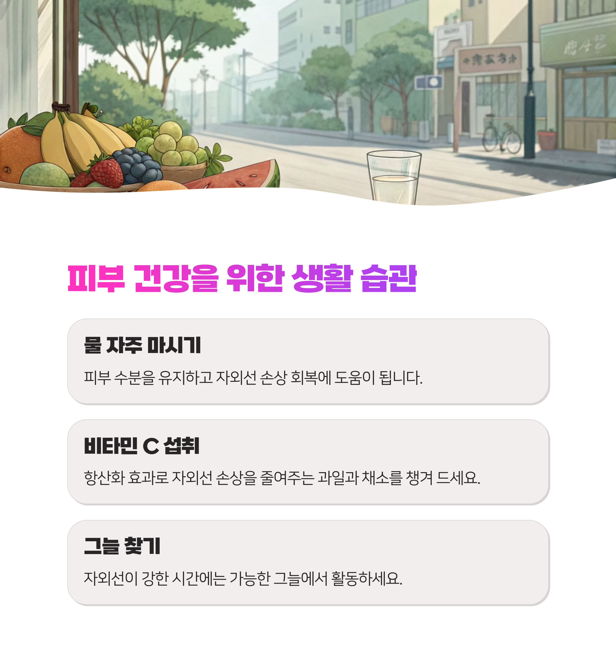 - 비타민 C 챙겨 먹기: 항산화 효과 짱인 비타민 C! 과일이나 채소로 챙겨 먹으면 자외선 때문에 피부 상하는 걸 좀 막아줄 수 있대요.
