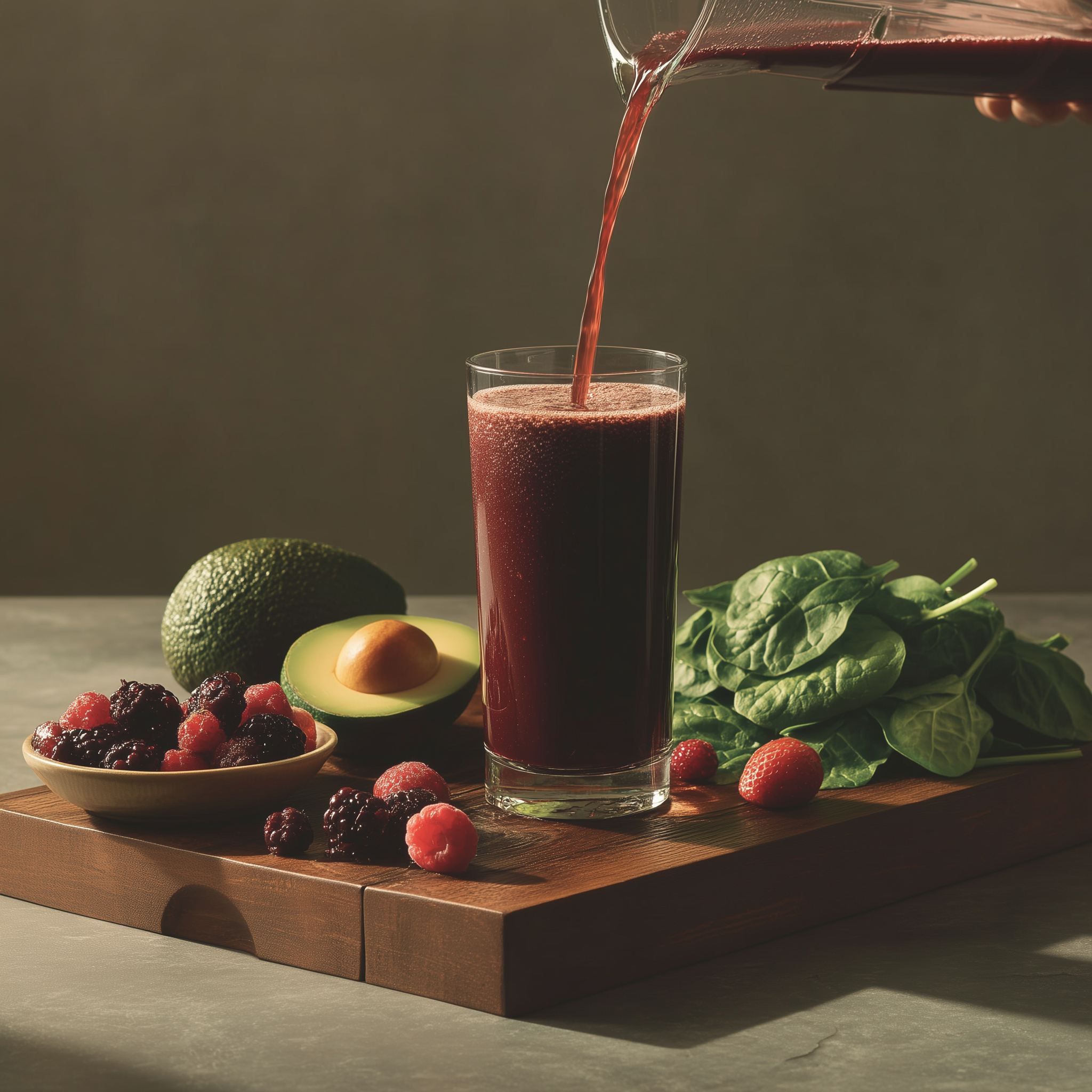 - 간편 레시피: 믹서기에 시금치나 케일 같은 녹색 채소 한 줌 (약 30g), 블루베리나 딸기 등 베리류 반 컵 (약 50g), 바나나 반 개 또는 아보카도 약간 (약 1/4개), 그리고 물 또는 우유/식물성 우유 150~200ml를 넣고 곱게 갈아주세요. 기호에 따라 단백질 파우더나 콜라겐 파우더를 추가해도 좋아요.