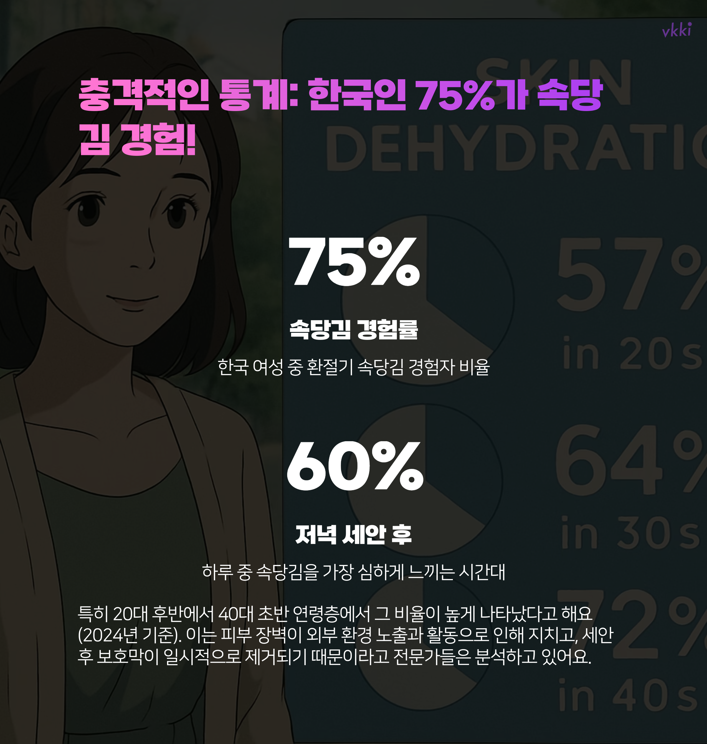 속당김은 남의 얘기가 아니에요. 최근 국내 피부 연구기관의 설문 결과에 따르면, 한국 여성의 약 75%가 환절기에 속당김을 경험한 적이 있다고 응답했으며, 특히 20대 후반에서 40대 초반 연령층에서 그 비율이 높게 나타났다고 해요 (2024년 기준). 또한, 하루 중에는 오후 늦게나 저녁 세안 후에 속당김을 가장 심하게 느낀다는 응답이 60%를 넘었습니다. 이는 피부 장벽이 외부 환경 노출과 활동으로 인해 지치고, 세안 후 보호막이 일시적으로 제거되기 때문이라고 전문가들은 분석하고 있어요.