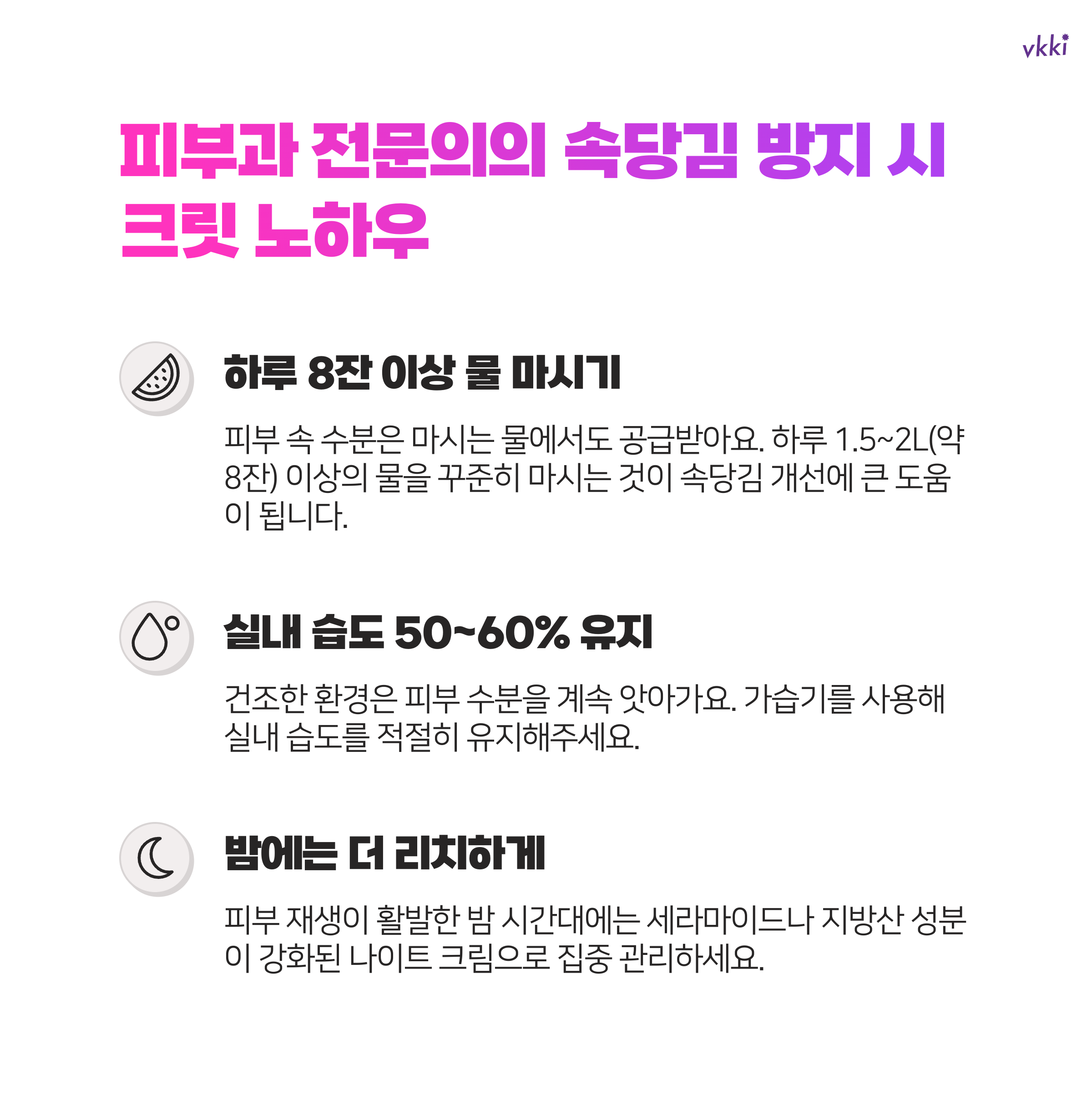 - 물💧 하루 8잔 이상 마시기! 피부 속 수분은 마시는 물에서도 공급받아요. 하루 권장량인 1.5~2L(약 8잔) 이상의 물을 꾸준히 마시는 것이 속당김 개선에 큰 도움이 됩니다.