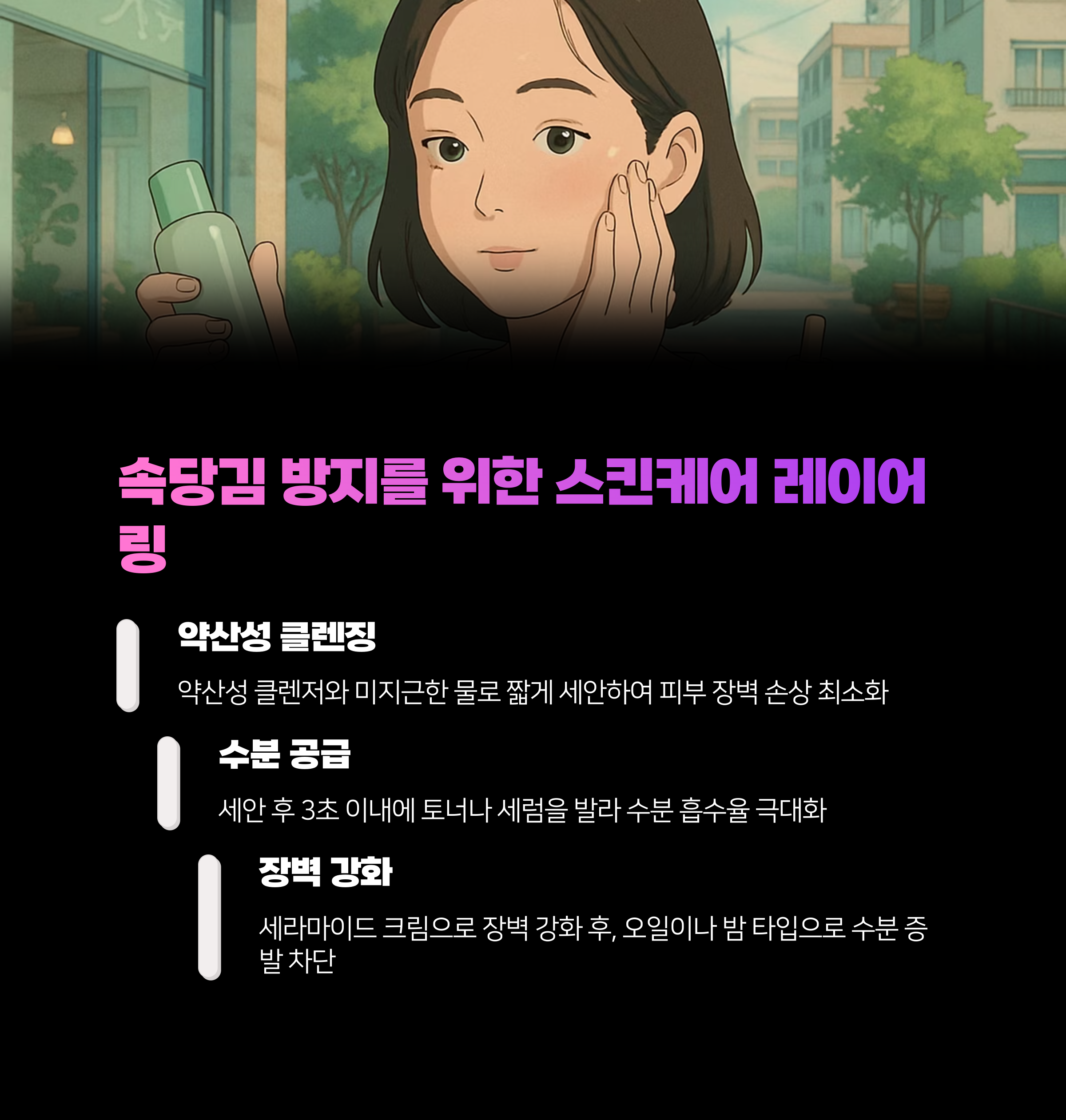 관리법도 중요해요. 세안 시에는 약산성 클렌저를 사용하고 뜨거운 물보다는 미지근한 물로, 최대한 짧은 시간 안에 마쳐서 피부 장벽 손상을 최소화하세요 🙏. 스킨케어 시에는 수분을 공급하는 제품(토너, 세럼)을 먼저 바르고, 그다음 장벽 강화 성분(세라마이드 크림), 마지막으로 수분 증발을 막는 오일이나 밤 타입을 덧발라주는 **'레이어링'**이 중요해요.