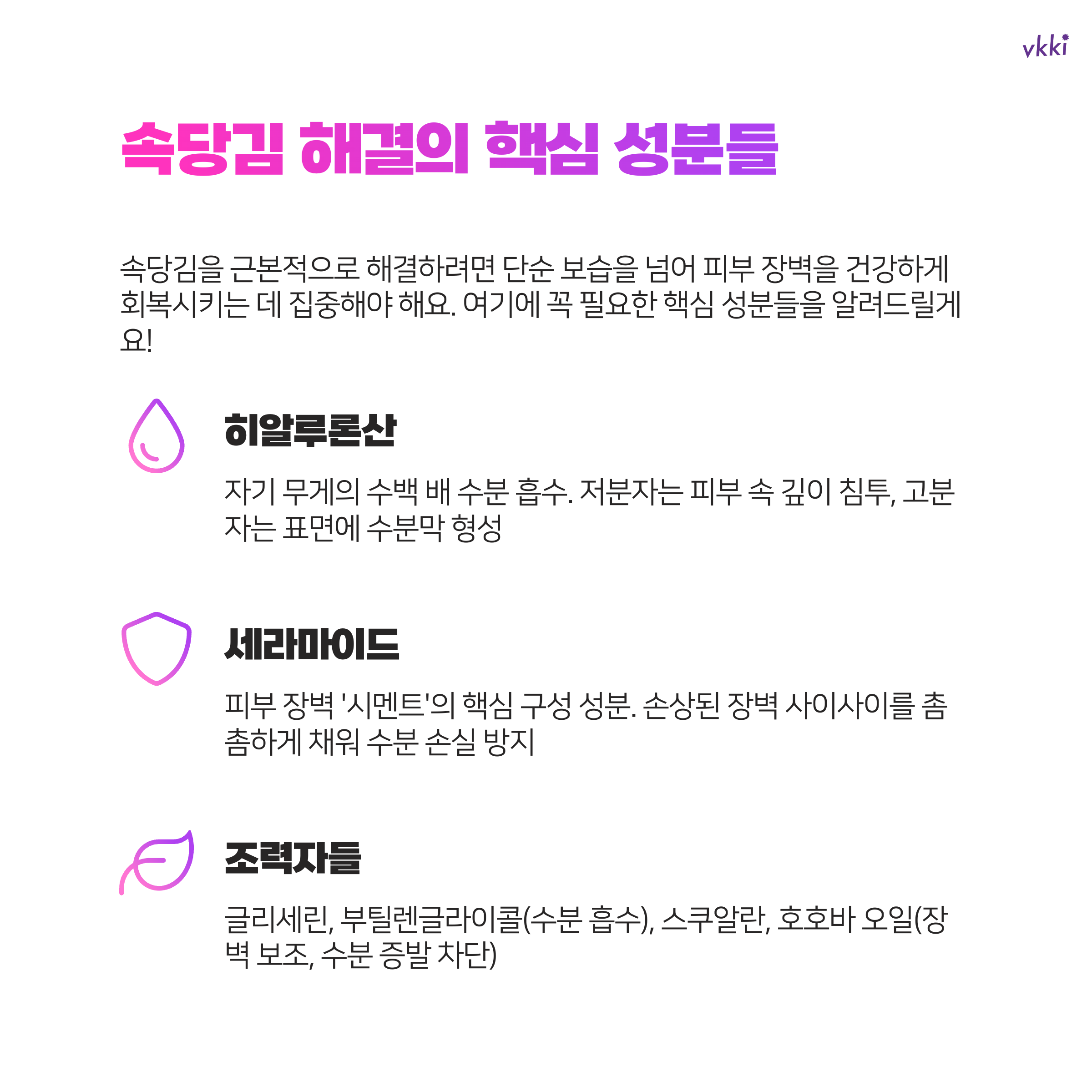 속당김을 근본적으로 해결하려면 단순 보습을 넘어 피부 장벽을 건강하게 회복시키는 데 집중해야 해요. 여기에 꼭 필요한 핵심 성분과 관리법을 알려드릴게요!