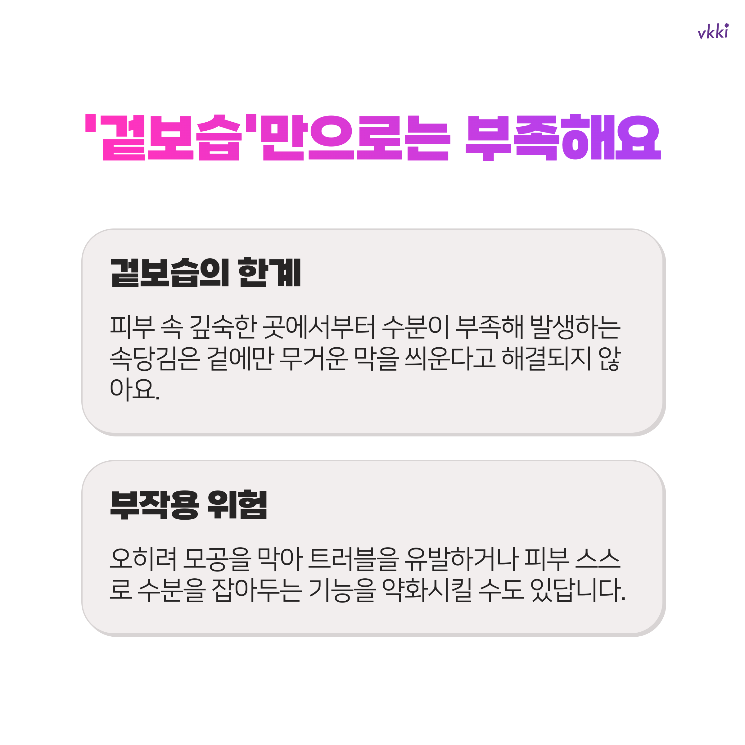 많은 분들이 피부가 당기면 그저 보습력이 아주 강한 크림이나 오일만 잔뜩 바르시죠? 🤔 물론 유분기 있는 제품은 피부 겉에 보호막을 형성해 수분 증발을 막아주는 중요한 역할을 해요. 하지만 이건 어디까지나 **'겉보습'**에 불과해요. 피부 속 깊숙한 곳에서부터 수분이 부족해 발생하는 속당김은 겉에만 무거운 막을 씌운다고 해결되지 않아요. 오히려 모공을 막아 트러블을 유발하거나 피부 스스로 수분을 잡아두는 기능을 약화시킬 수도 있답니다.