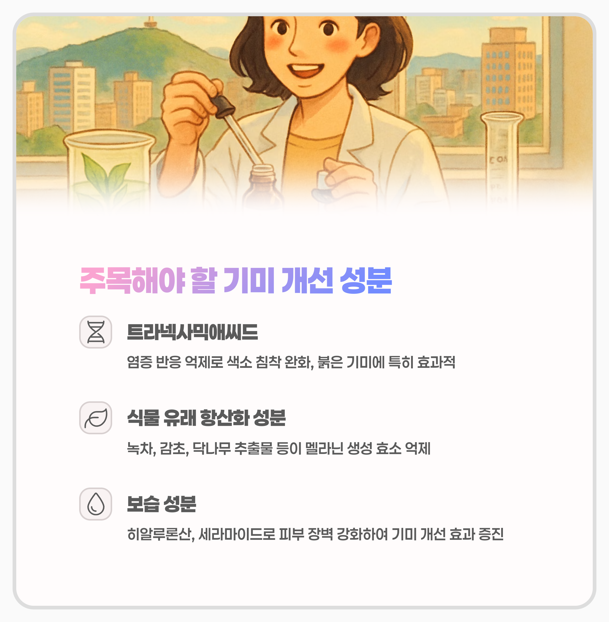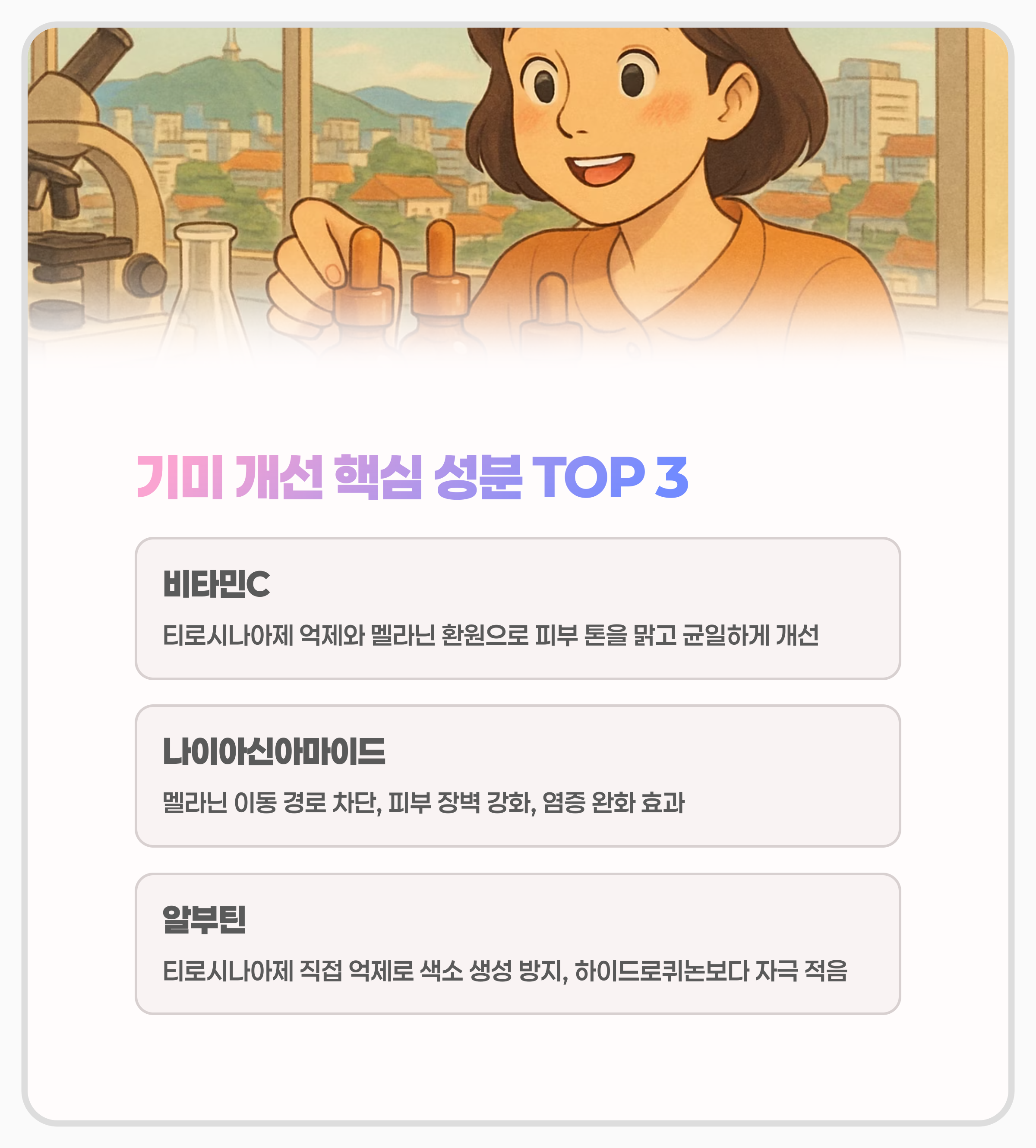 기미 개선 효과가 과학적으로 입증되었거나 임상적으로 많이 사용되는 대표적인 성분들입니다.