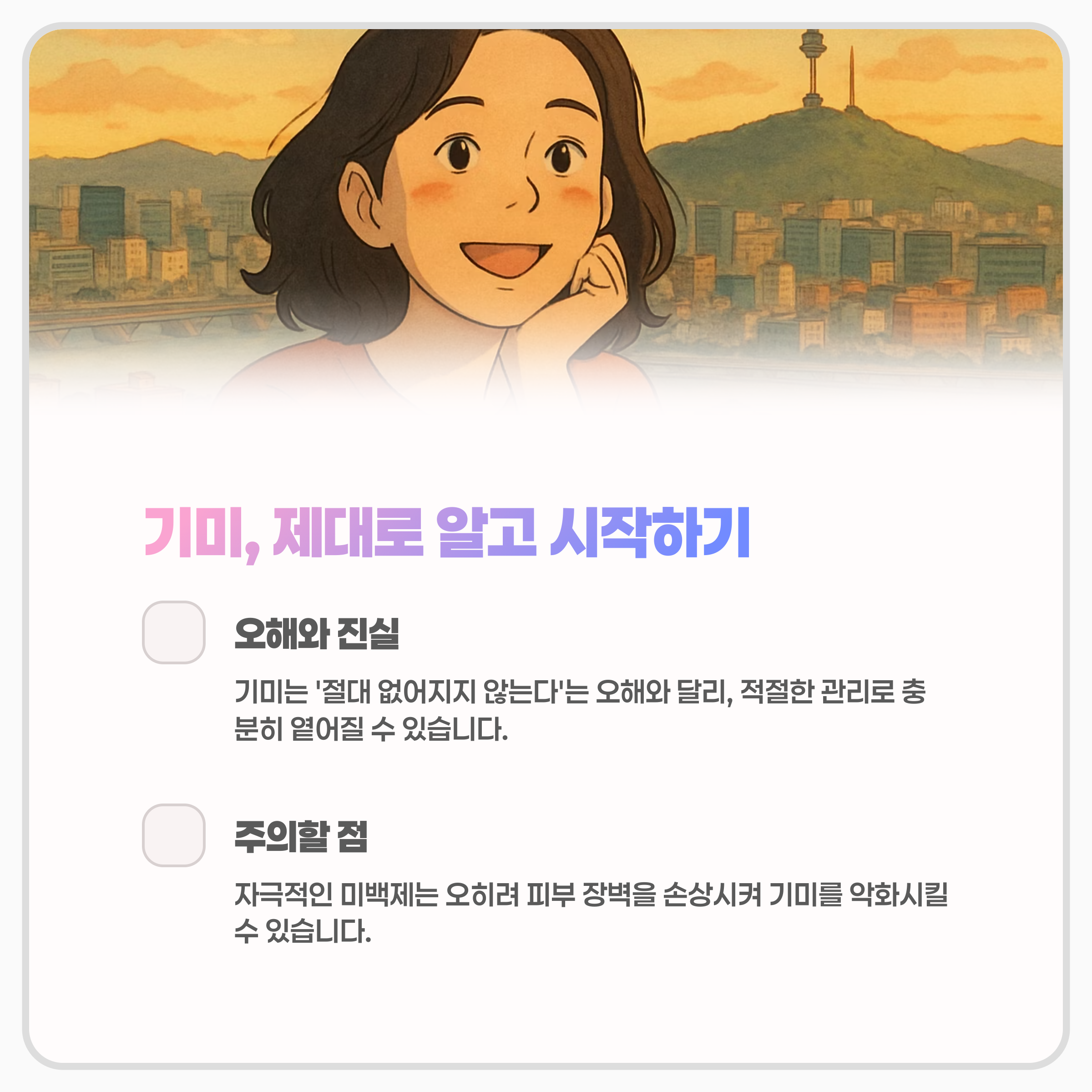 거울 볼 때마다 신경 쓰이는 기미 때문에 고민이신가요? 자외선, 스트레스, 호르몬 변화 등 다양한 원인으로 발생하는 기미는 한번 생기면 쉽게 사라지지 않아 많은 분들의 피부 고민 1순위로 꼽힙니다. 하지만 좌절하기는 일러요! 올바른 성분을 이해하고 꾸준히 관리한다면 기미를 충분히 옅게 만들고 예방할 수 있습니다.