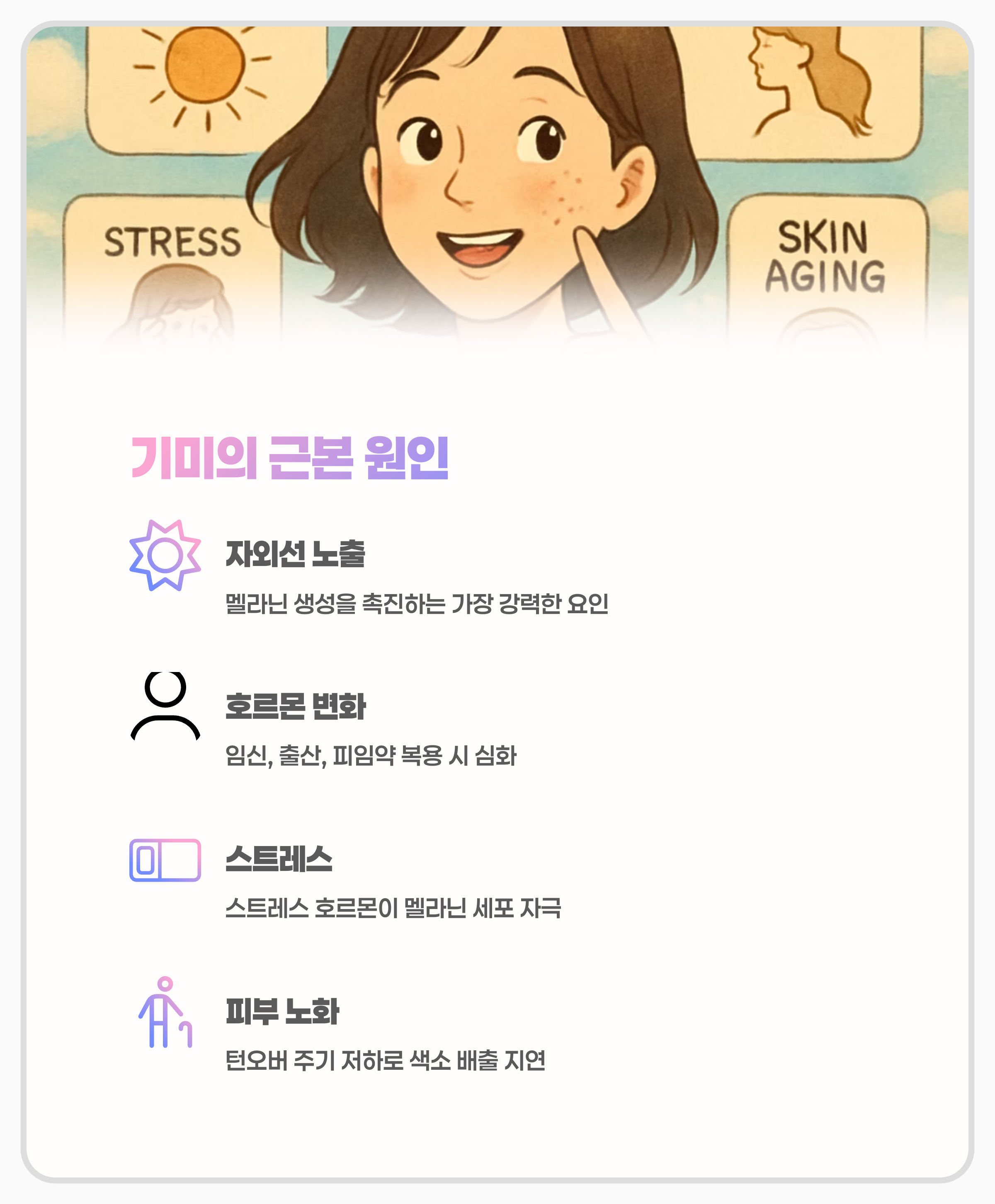 - 여성호르몬 변화: 임신, 출산, 경구 피임약 복용 시 기미가 심해지는 경우가 많습니다.