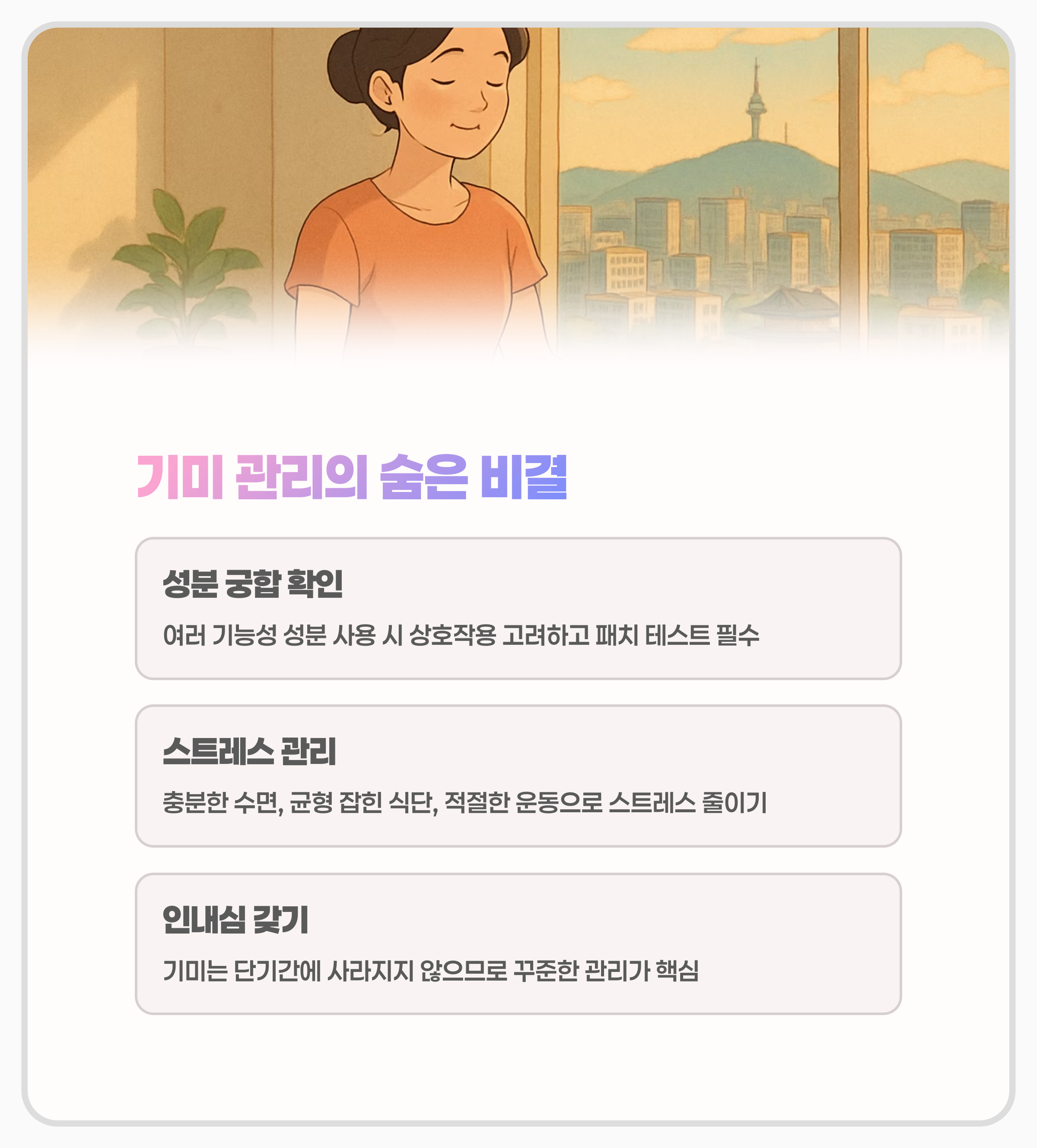 - 🧪 성분 궁합 & 패치 테스트: 여러 기능성 성분을 함께 사용할 때는 성분 간의 궁합을 확인하고, 처음 사용하는 성분이나 민감하게 반응할 것 같은 성분은 귀 뒤나 팔 안쪽에 소량 발라보는 패치 테스트를 먼저 진행하는 것이 안전합니다.