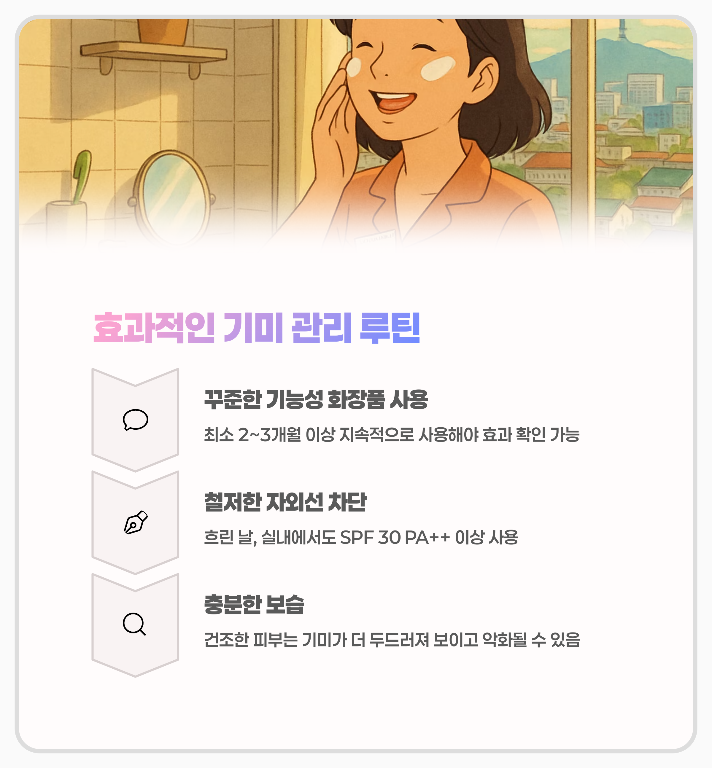 - 꾸준함이 핵심: 아침저녁으로 기미 개선 기능성 화장품을 세안 후 스킨케어 첫 단계 또는 에센스/세럼 단계에서 꾸준히 사용하세요. 최소 2~3개월 이상 꾸준히 사용해야 눈에 띄는 효과를 기대할 수 있습니다.
