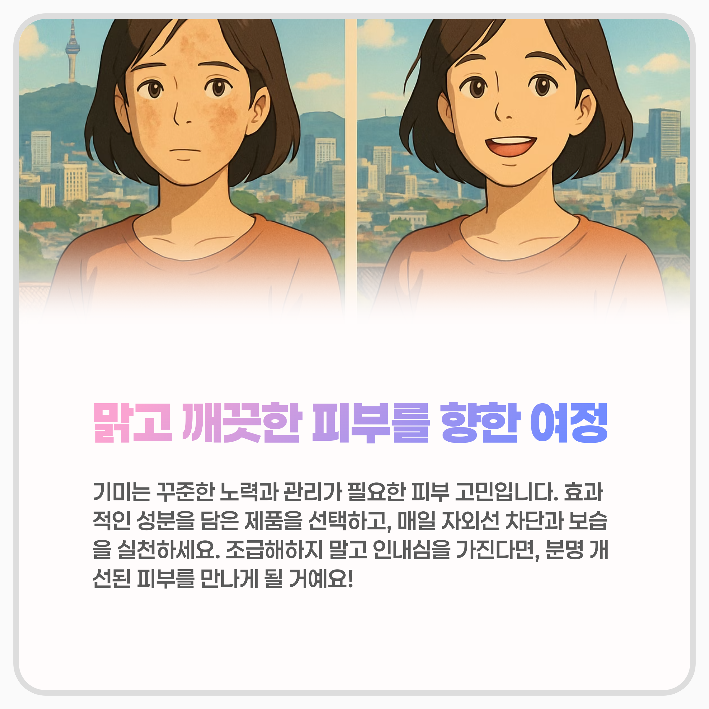 - 🌞 자외선 차단은 필수 중의 필수! 자외선은 기미를 만드는 가장 큰 원인이자 이미 생긴 기미를 악화시키는 주범입니다. 흐린 날이나 실내에서도 자외선 차단제(SPF 30 PA++ 이상)를 매일, 꼼꼼하게 바르는 습관을 들이세요. 외출 시에는 모자나 선글라스를 착용하는 것도 좋습니다.
