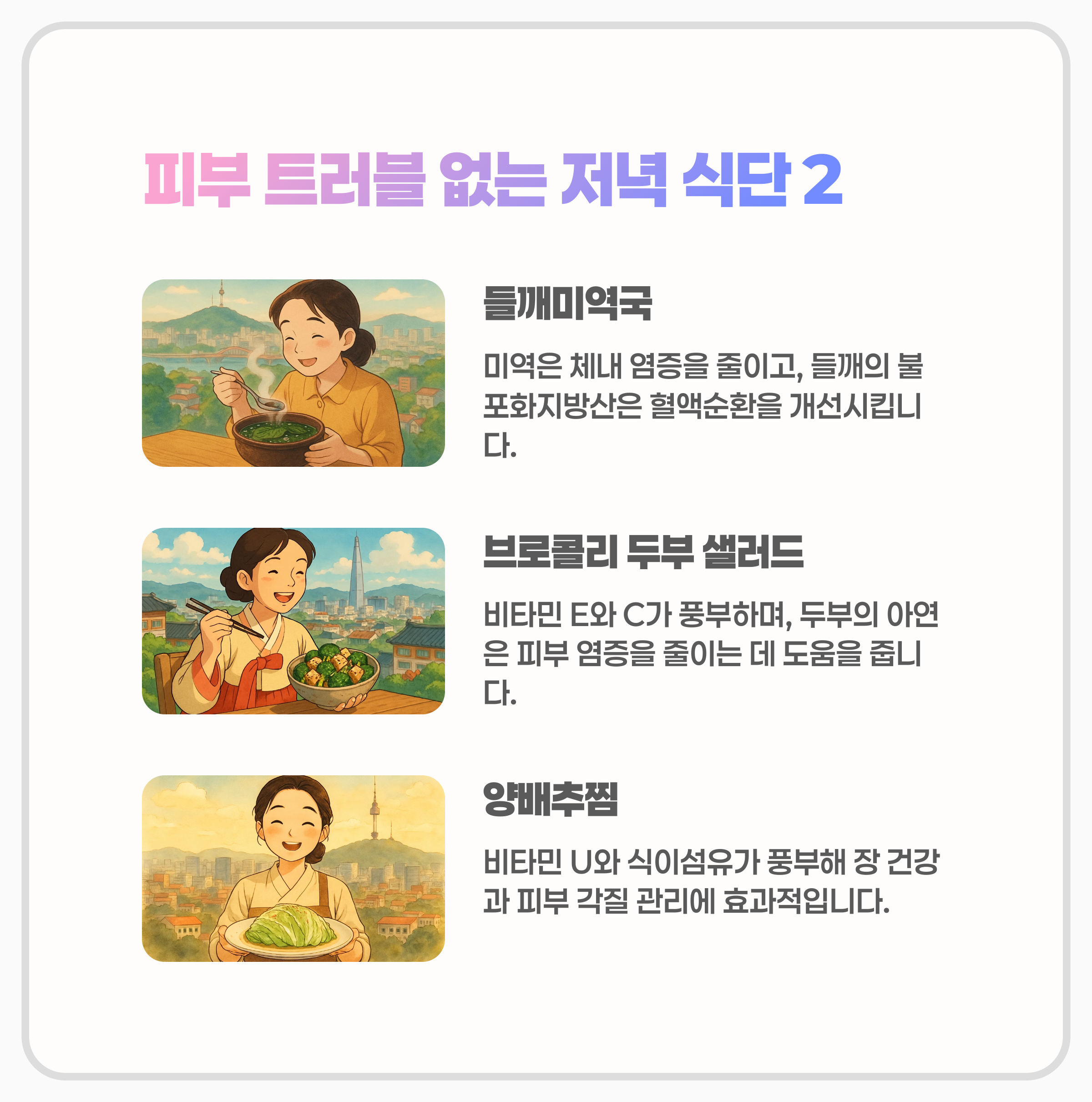 피부 트러블이 걱정 없는 건강한 저녁 식단은 항염증 식품을 중심으로, 신선한 재료로 가볍게 구성하는 것이 핵심입니다.