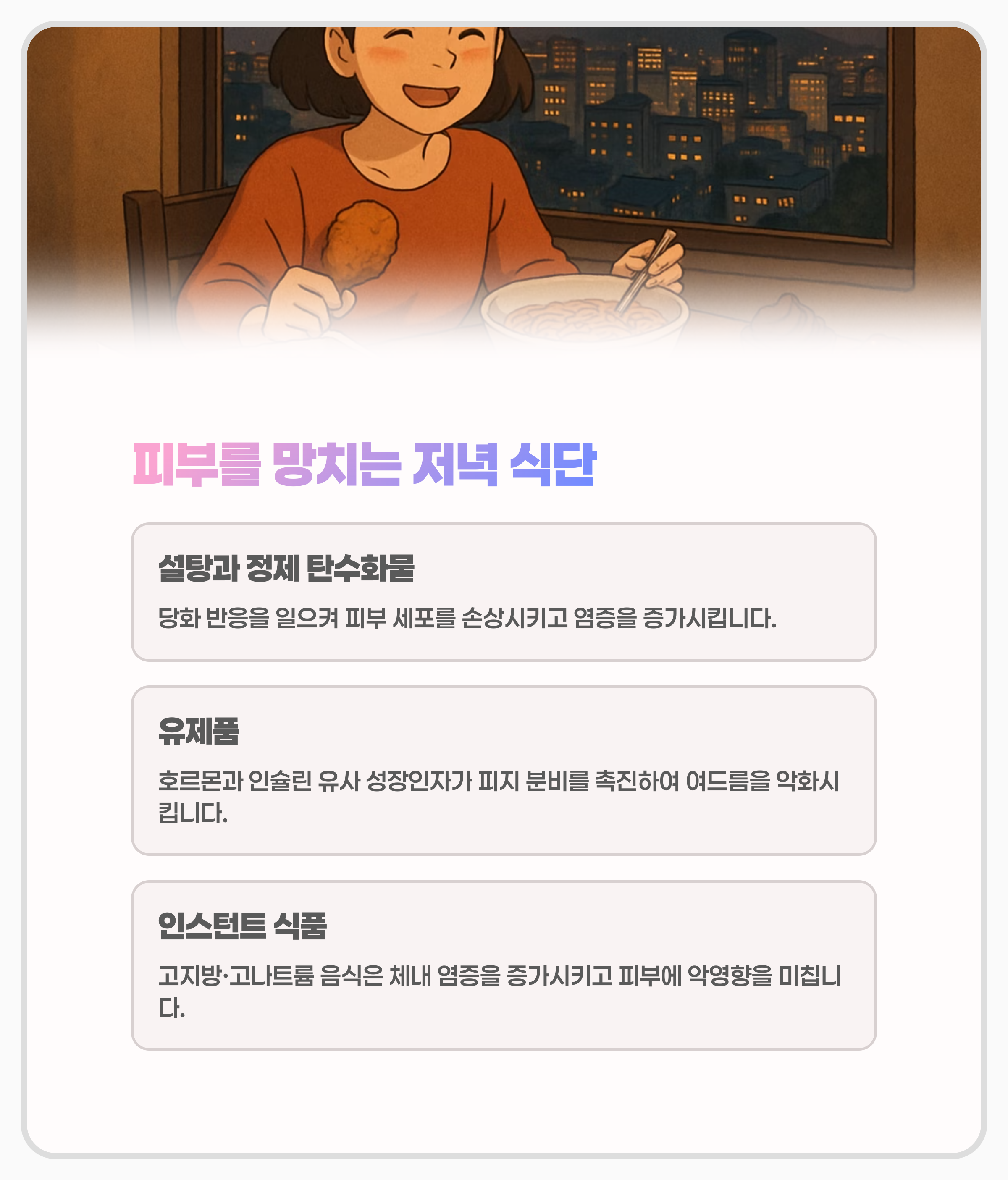유제품에 포함된 호르몬과 인슐린 유사 성장인자는 피지 분비를 촉진하여 여드름 및 피부 염증을 악화시킬 수 있어요. 저녁에 자주 찾게 되는 인스턴트 식품이나 치킨, 라면과 같은 고지방·고나트륨 음식은 체내 염증을 증가시키고 피부에 악영향을 미칩니다.