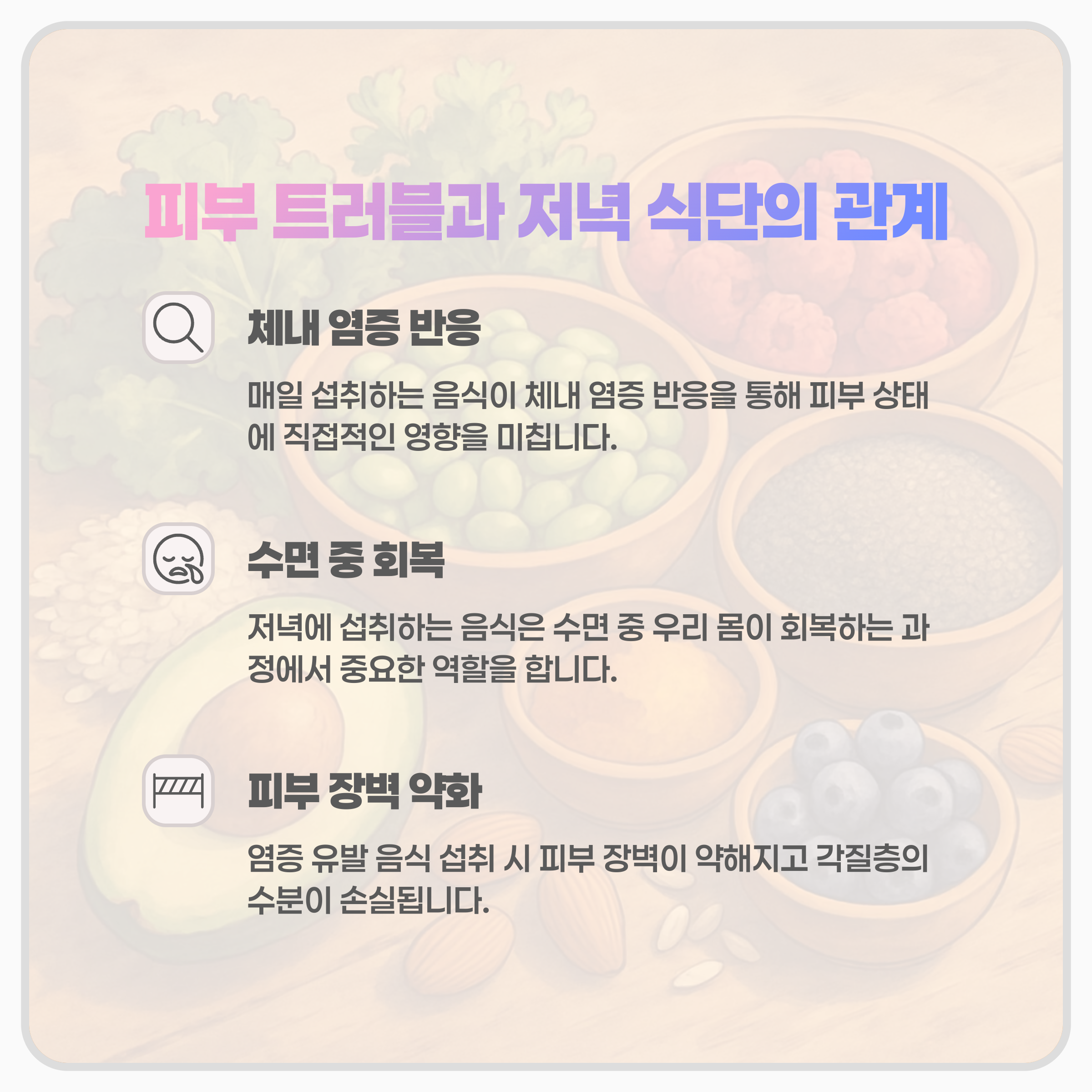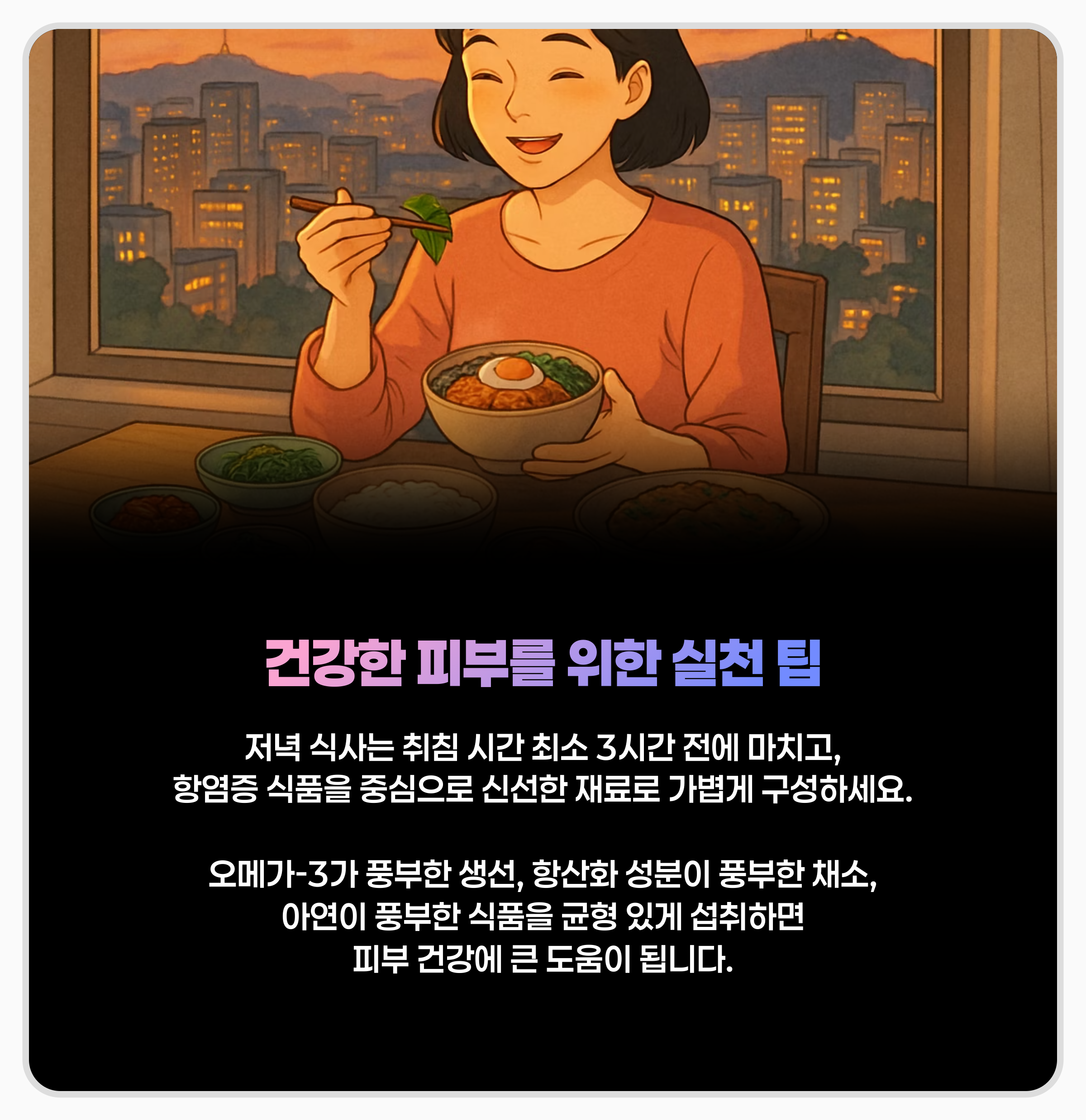 피부 트러블은 단순히 외부 요인만으로 생기는 것이 아니에요. 우리가 매일 섭취하는 음식이 체내 염증 반응을 통해 피부 상태에 직접적인 영향을 미칩니다. 특히 저녁에 섭취하는 음식은 수면 중 우리 몸이 회복하는 과정에서 중요한 역할을 하기 때문에 더욱 신경 써야 해요.